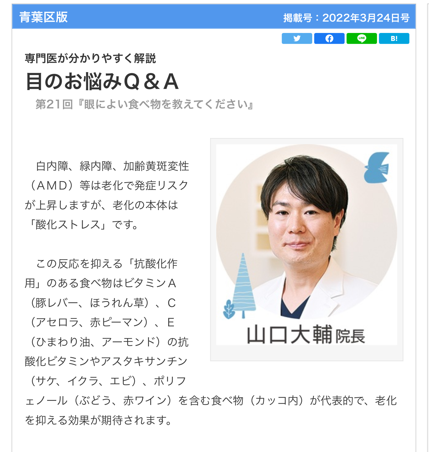 タウンニュース青葉区・都筑区・宮前区版で毎月連載させていただいている『目のお悩みQ&A』第21回目の今回は『眼によい食べ物を教えてください』というテーマで書いてみました。