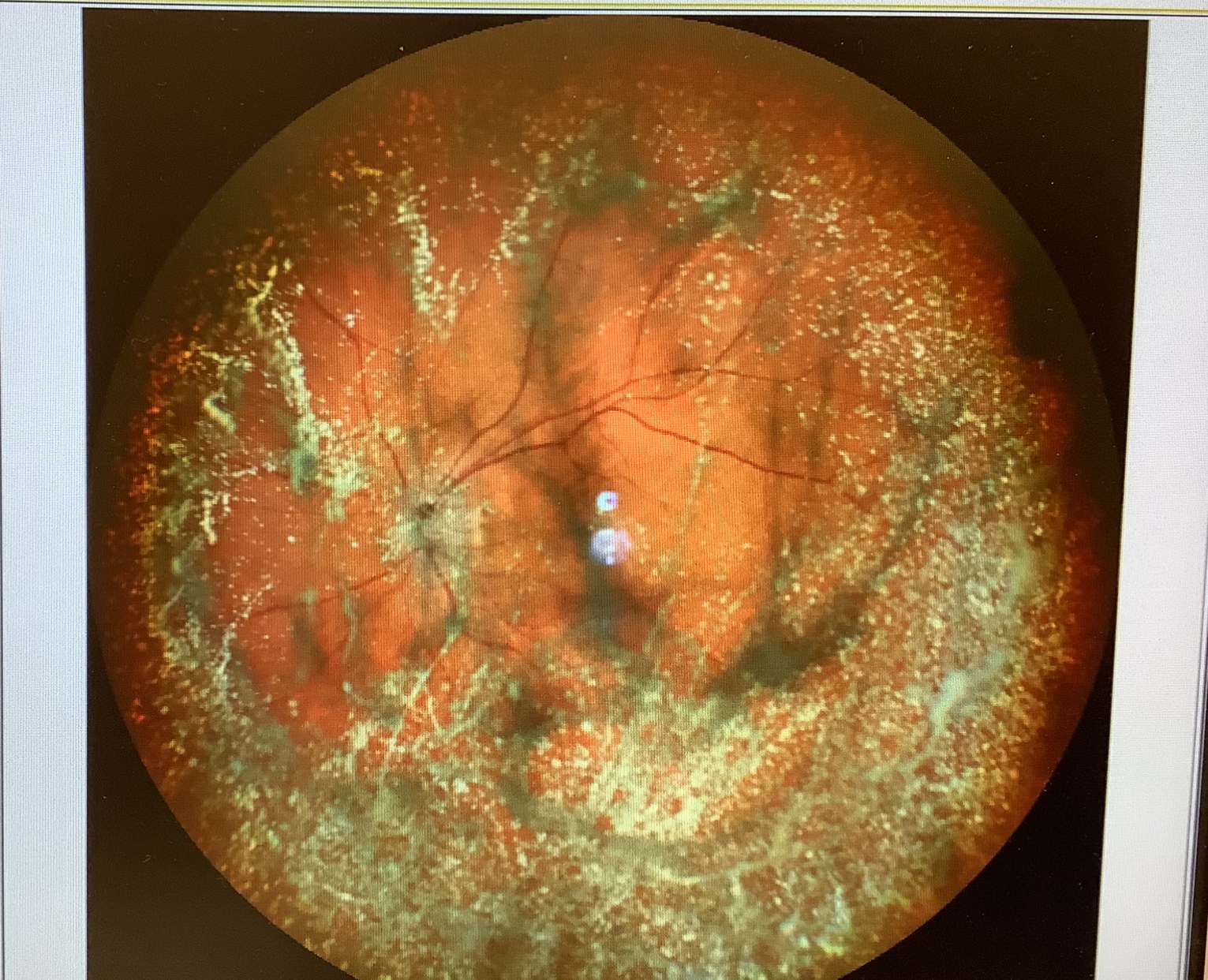 ただ、硝子体手術では硝子体の一番外側の硝子体皮質を網膜から剥がす『硝子体剥離』を作る操作が難しく(硝子体皮質と網膜の癒着が強いため)、今回の患者さまでも硝子体剥離を起こす操作の際に、網膜の弱い変性巣が穴になって、一部、網膜が剥がれてしまいました。そのため、硝子体手術では眼の中に水を入れて手術しますが、水を空気に換え、網膜の下に入り込んだ水を抜き、網膜を元の位置に戻し、穴の周りをレーザーで固め、最終的に空気を医療用のて手術を終えてきました。ガスを入れると、術後しばらくの間、見えにくい状態が続いてしまいますが、視力自体にはあまり影響が出にくい星状硝子体症の手術で視力障害が出てしまうことはなんとしても避けたいところですので、なるべく確実に治るようにガスを入れてきました。1週間程度見えにくさが続くと思いますが、ガスが減ってきてしっかり見えてきてくれればと思います。