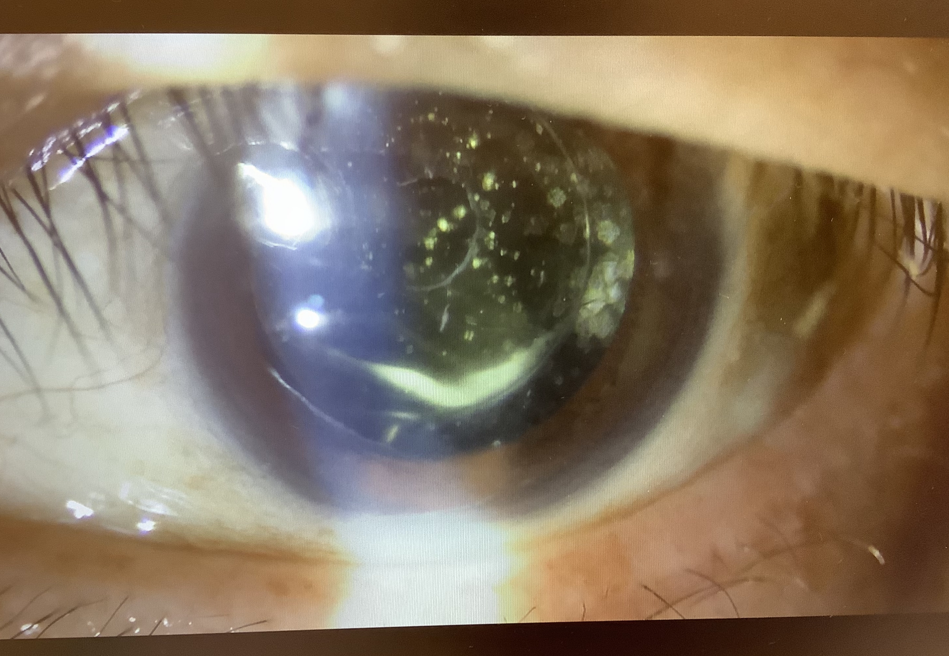↑前房洗浄を行った患者さまの前眼部写真。レンズの前後面にフィブリンが付着しています。