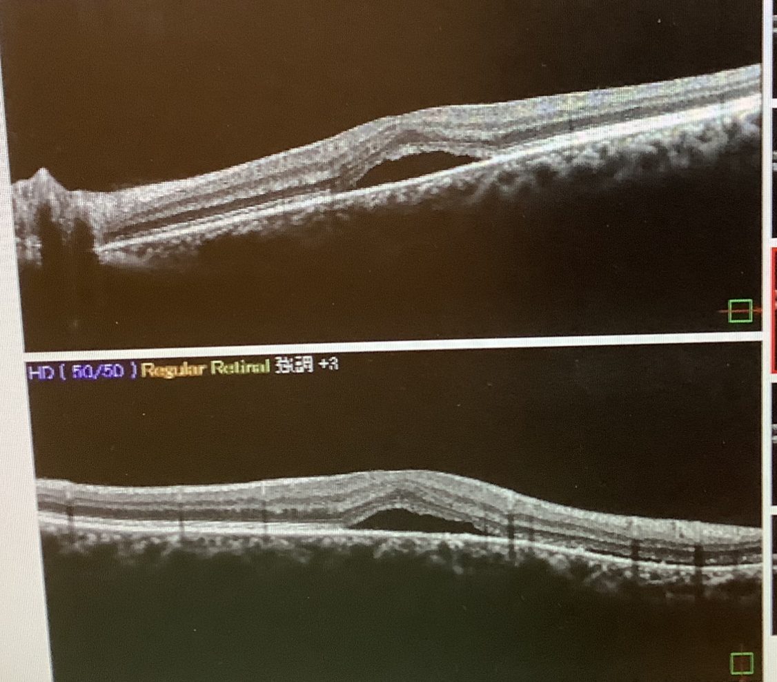 左眼の状態は、OCT検査で黄斑部の網膜の下に液体が貯留した“漿液性網膜剥離”(SRD)という所見が見られ、『中心性漿液性網脈絡膜症(CSC)』という病気と考えられました。40〜50代の男性によくみられる疾患で、網膜の下の脈絡膜という部分に何らかの炎症が起こり、脈絡膜側から液体成分が漏れ出すことで、網膜の下に水が貯まり、そのせいで、見えにくさ、歪み、物が小さく見える(小視症)などの症状が現れます。自然軽快することも多いですが、長引く場合や、一旦よくなってもまたぶり返す再発例では、より詳しい検査(蛍光眼底造影検査;FAG)を行い、水の漏れ出る場所を特定し、中心部からある程度、離れていれば、通常のレーザー治療を、中心部付近であれば(通常のレーザーではレーザーを照射したところが見えにくい暗点になってしまうので)、特殊な薬を点滴してからのレーザー治療(光線力学療法;PDT)が有効とされています。