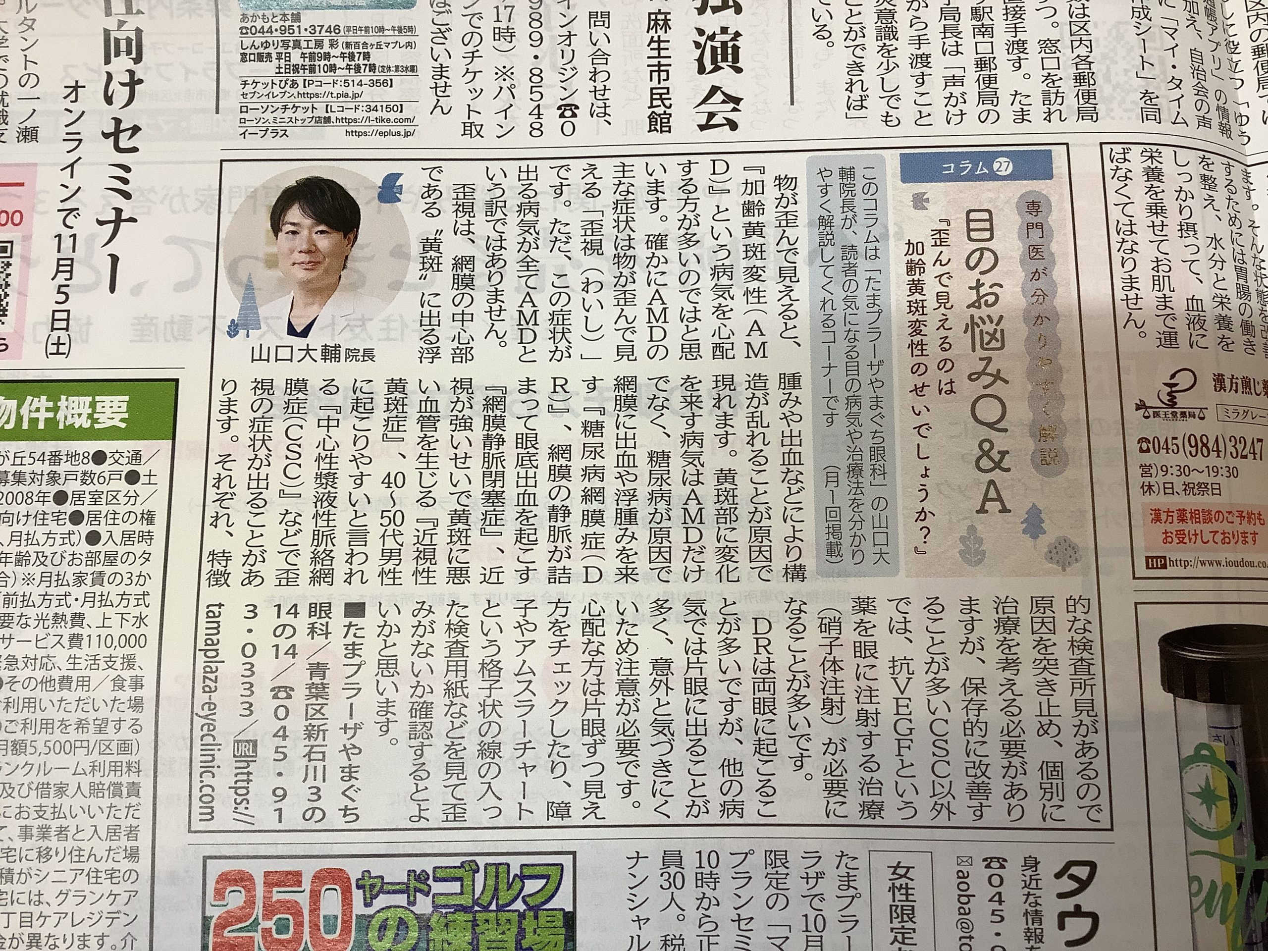 タウンニュース青葉区・都筑区・宮前区版で毎月連載させていただいている『目のお悩みQ&A』第27回目の今回は『歪んで見えるのは加齢黄斑変性のせいでしょうか?』というテーマで歪みの症状を来す疾患について書いてみました。