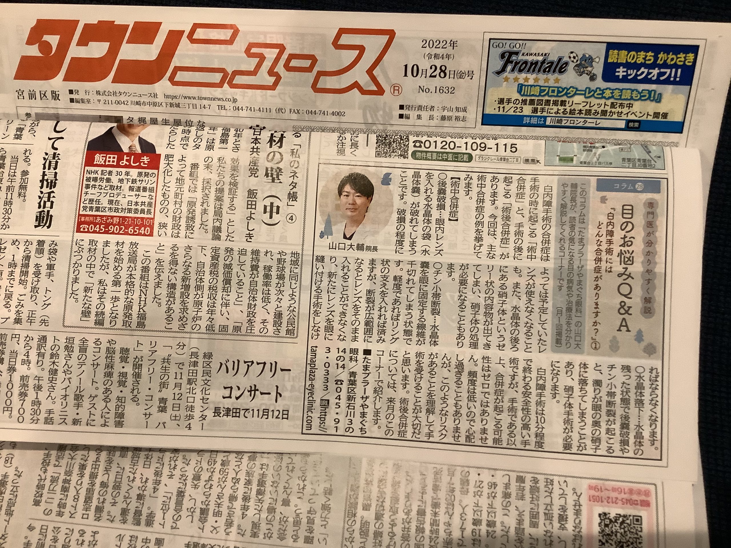 タウンニュース青葉区・都筑区・宮前区版で毎月連載させていただいている『目のお悩みQ&A』第28回目の今回は『白内障手術にはどんな合併症がありますか?』①というテーマで白内障の手術中の合併症について書いてみました。