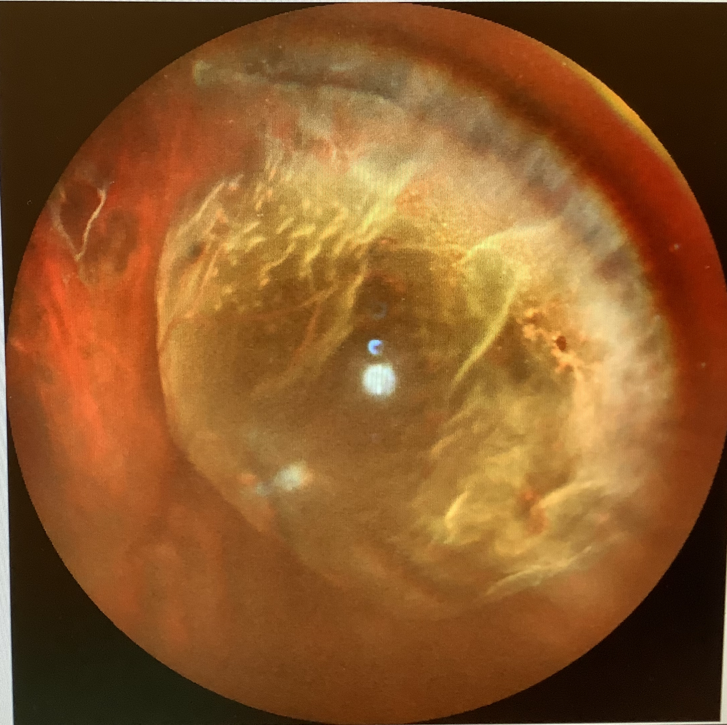 網膜剥離の方は40代半ばの男性で、15年前にレーシックを受けていましたが、元々とは強度の近視の上にアトピー性皮膚炎もある方でした。近視が強いと網膜が薄くなり穴が開き、網膜剥離が起こりやすいとされています。レーシックを受けていると、近視が治っと感じ、近視の眼に起こりやすい病気は起こらなくて済むのかと思いがちですが、元々の近視の眼の特性は残るので、網膜剥離が起こりやすいというリスクは残ることになります。更にアトピーがあると、より網膜剥離は起こりやすくなるため、特に注意が必要であったと思います。