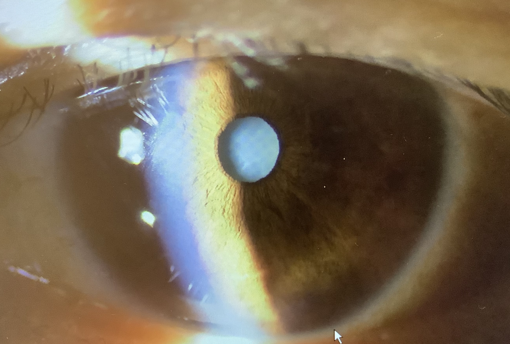 今日の白内障の60歳男性の方は白内障が真っ白になってしまう“成熟白内障”という状態でした。成熟というとなんだかおいしそうな感じがしますが(熟成肉のような感じが、、、)、決してそんなことはなく、むしろ厄介な白内障です。水晶体が真っ白になるだけでなく、膨張するので、手術の時に水晶体の袋の前面を丸く切開するCCCという操作が難しくなります。真っ白で見えにくいだけでなく、このような白内障は液化して膨張しているので、CCCを作る時に外側へ流れてしまい、きれいに丸く切開できなかったり、裂け目ができてしまう恐れが高くなってしまいます。そのため、青い染色液で水晶体嚢を染めて見やすくし、液化した水晶体を吸引して減圧してからCCCを拡げる操作を行うといった工夫が必要になります。