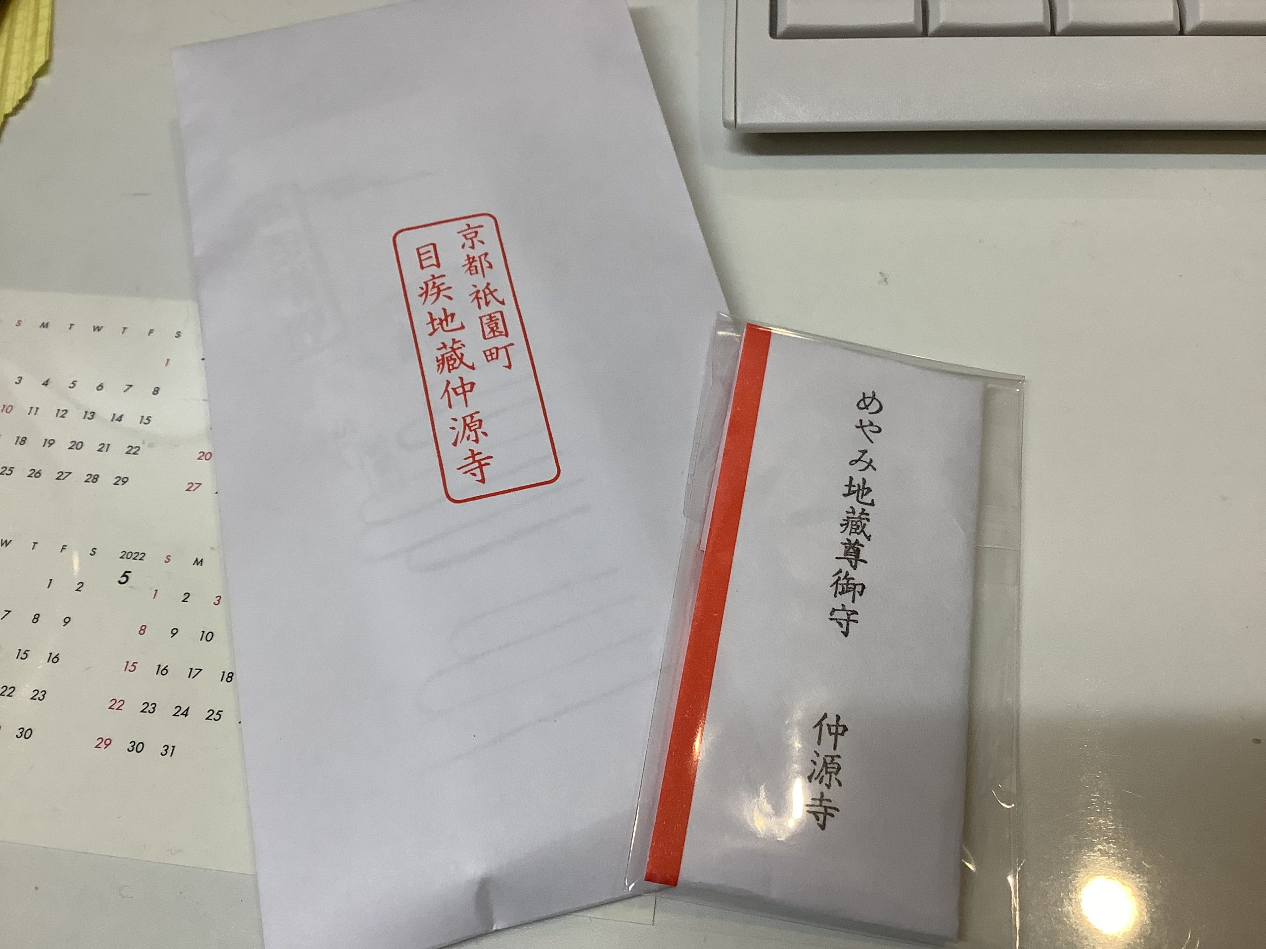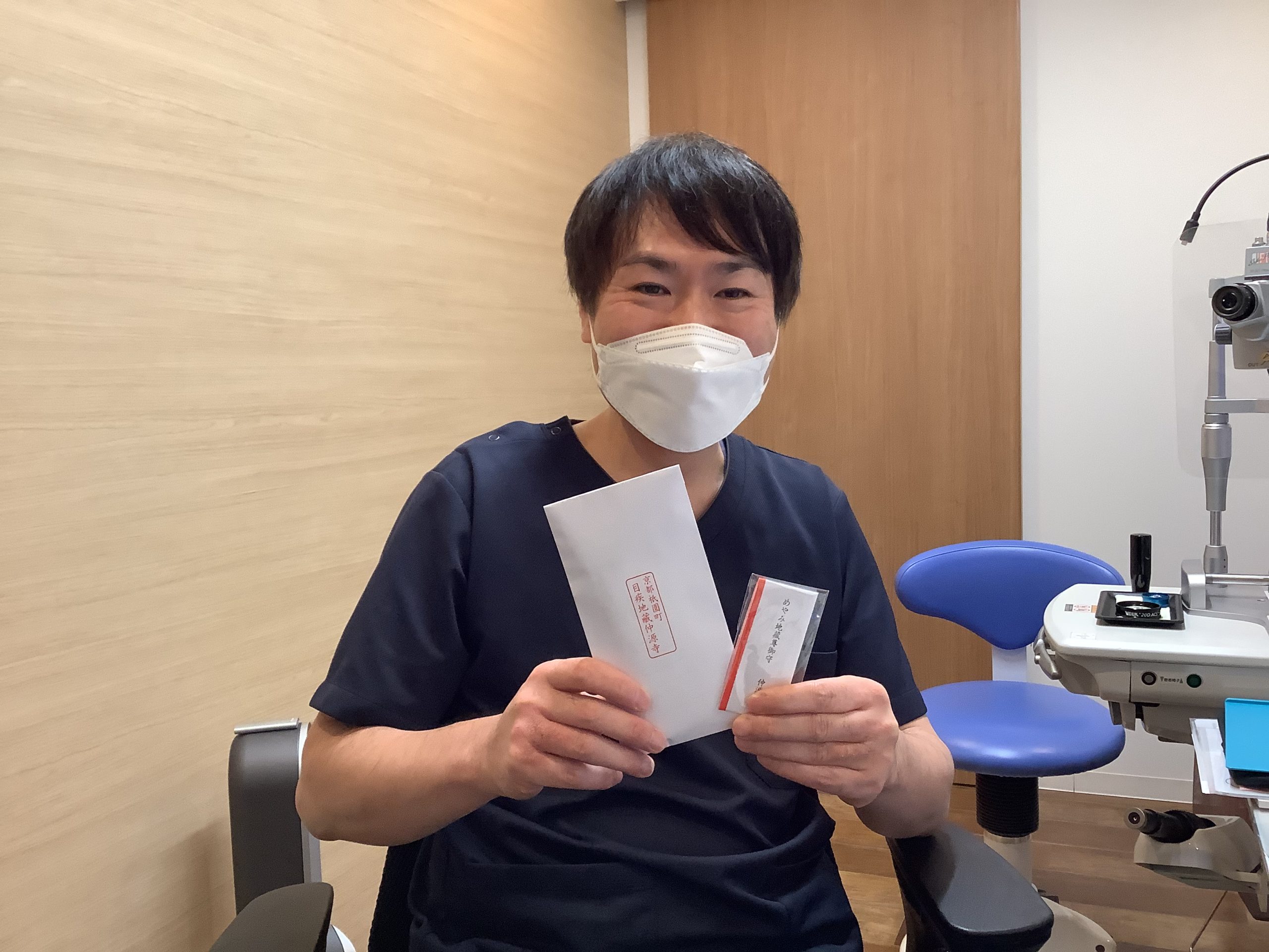 それから、今日は外来通院中の患者さまから京都の目疾(めやみ)地蔵のお寺のお札をいただきました。ご実家が京都で偶然見かけたそのお寺で、“通っている皆さんのために”と買ってきてくださったそうです。ご自身も術後の療養中にもかかわらず、そのお気持ちがとてもうれしく、ありがたく感じました。どうもありがとうございますm(_ _)m