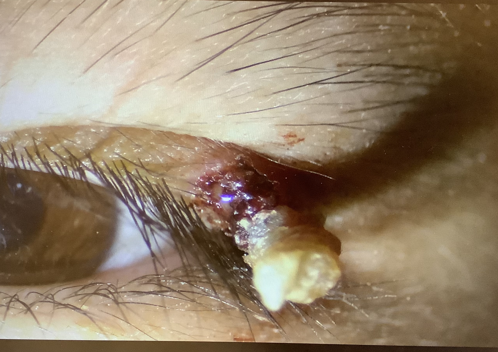7歳の女の子の霰粒腫は瞼の縁からピノキオの鼻のようにどんどん伸びていく腫瘤となっていました。こんな長い霰粒腫は初めて見たと思ったのですが、切開の準備で消毒をして麻酔をして、表面を拭いていたら、その長く突出した霰粒腫(と思われていた部分)がポロッと取れて、皮膚にはいつもくらいの霰粒腫ができているだけでした。本当の霰粒腫自体はそれほど大きくなく(長くなく)、霰粒腫からの分泌物(液体成分?)が固まってかさぶたのようになって、成長した状態だったようです。もちろん、霰粒腫はいつも通りに切開して無事に処置を終えることができました。