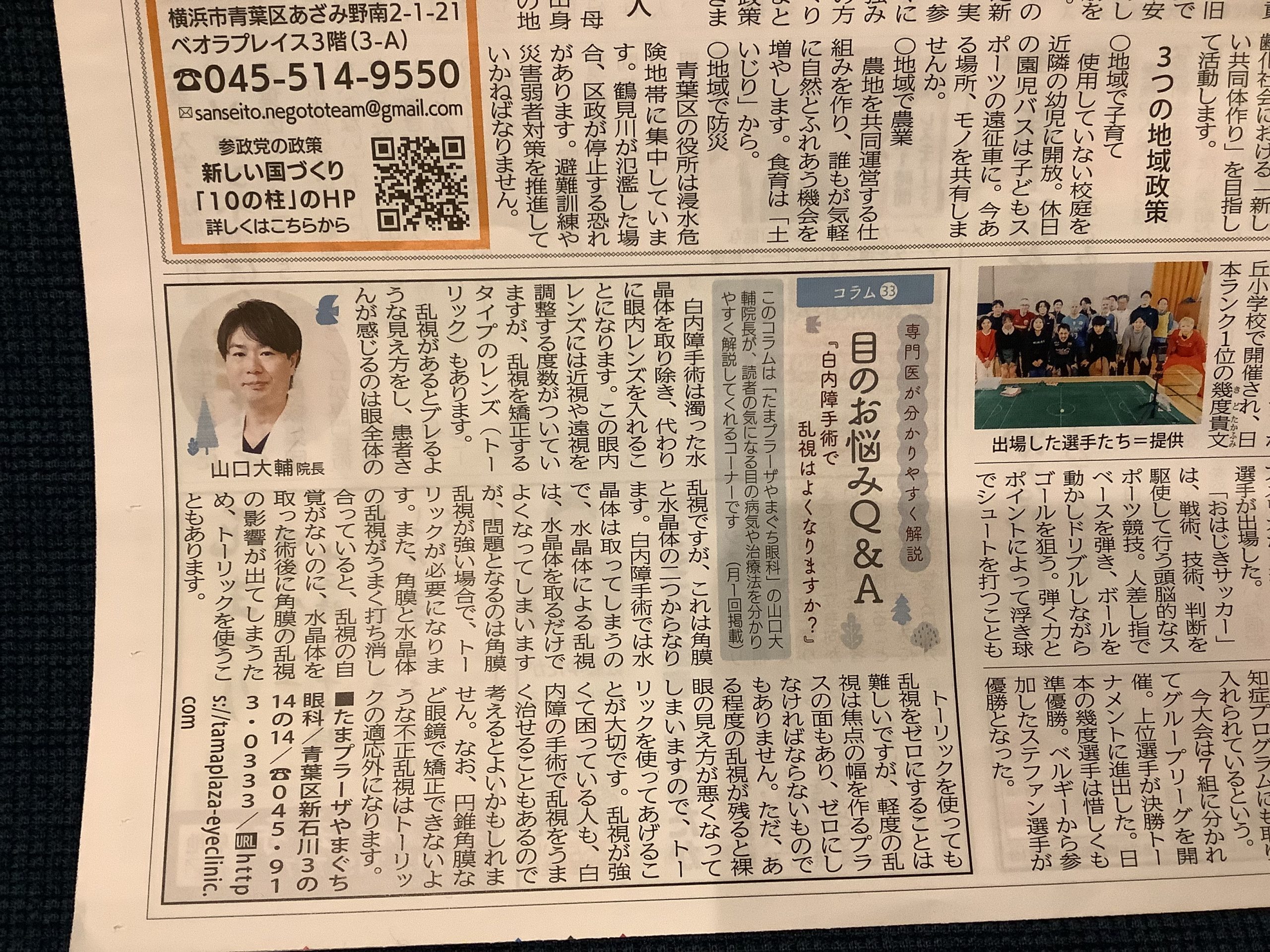 タウンニュース青葉区・都筑区・宮前区版で毎月連載させていただいている『目のお悩みQ&A』第33回目の今回は『白内障手術で乱視はよくなりますか?』というテーマで、白内障手術の時の乱視矯正について書いてみました。