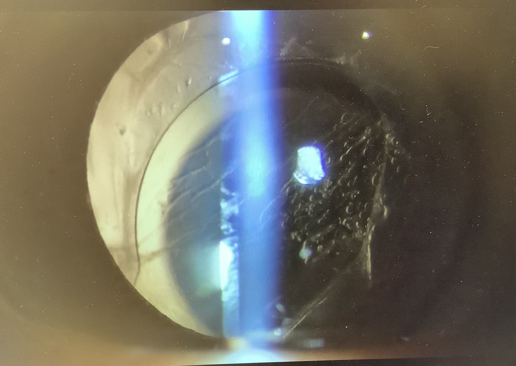 外来では他院で以前、単焦点レンズの白内障の手術を受け、術後より、見えにくいので状態を診て欲しいと歳の女性の方がいらっしゃいました。症状を聞くと、右眼のみ、『はっきり見えない』『物がブレて見える』『夜、灯りの下に光の線が広がって見える』といった症状があり、眼の中を見ると、眼内レンズが水平方向にも前後方向にもズレて入っていました。一般的な眼内レンズには支えの部分(支持部)が2つあり、通常、この支えをきちんと水晶体嚢の中に収めてくるのですが(嚢内固定)、おそらく、片方の支えは水晶体嚢の中に、もう片方は水晶体嚢の外にあるのが原因と思われました。嚢外固定となっている部分の水晶体嚢は前後で癒着が強くなって剥がすことが難しいので、もし治療するとすれば、今のレンズを取り出し、新たなレンズを水晶体嚢の前面に固定して(嚢外固定)、真っ直ぐに光が通るようにすることで、見え方はクリアにできるかと思われました。