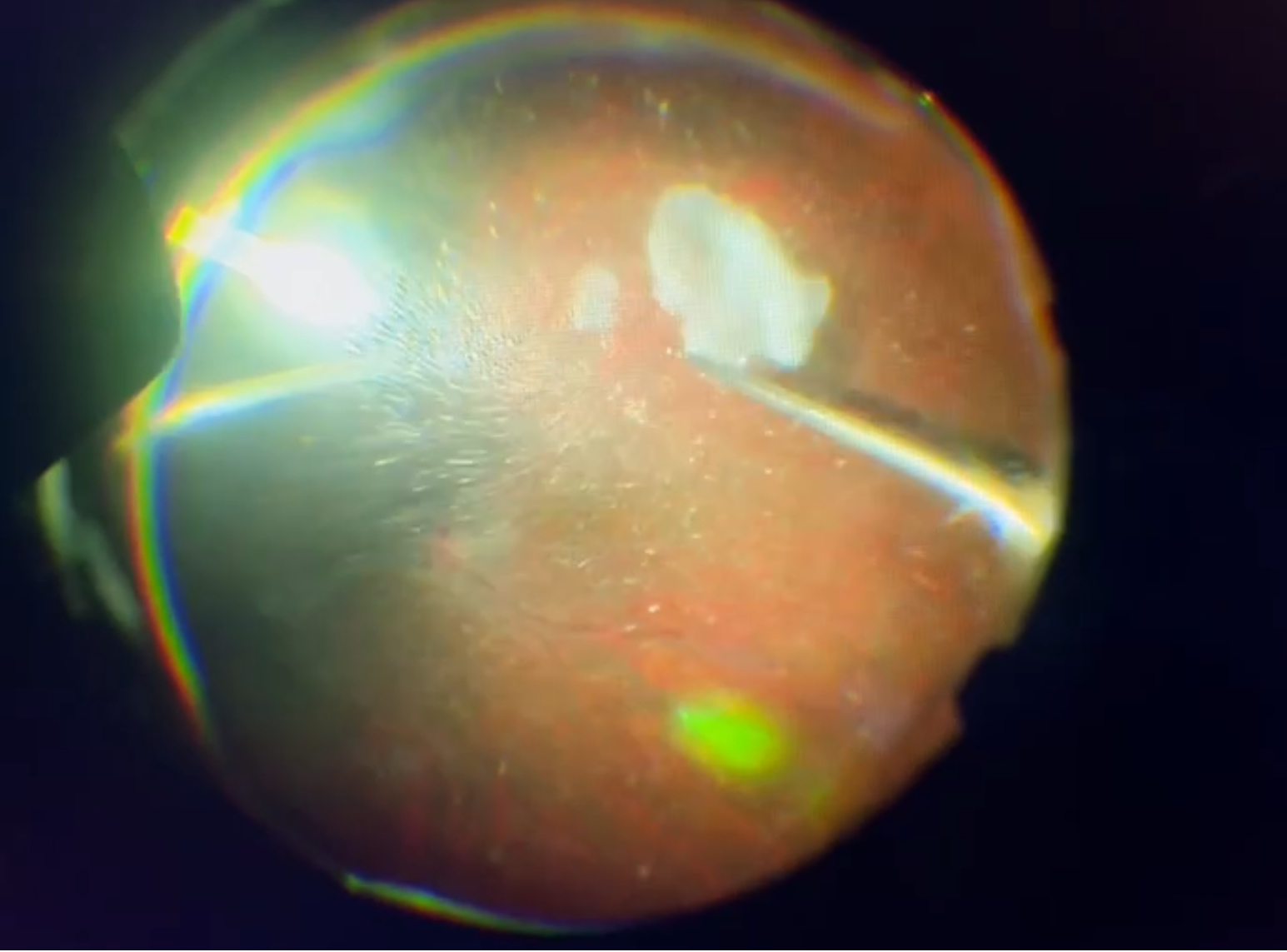 今日の硝子体手術は61歳の女性の方で、先月、白内障の手術をさせていただきましたが、超音波で水晶体の硬い部分(核)を砕いて吸い取る操作の時に、水晶体の袋(水晶体嚢)の後ろ側の部分(後嚢)に裂け目ができてしまう“後嚢破損”を起こしてしまい、水晶体の濁りが眼の奥の方(硝子体の中)に落ちてしまいました(水晶体落下)。小さな濁りはある程度、時間の経過で吸収されていきますが、それまでは飛蚊症として感じますし、この方の場合、大きめの濁りも落ちてしまったので、視野の端の方に大きな影が動いて見えるような症状もあり、また、そのような大きな濁りが長く残ると網膜に炎症を起こす可能性もあったので、今回、その濁りを取るために硝子体手術をさせていただきました。大きな濁りといっても米粒程度で硬さもなく、一瞬で吸い取れてしまいましたが、その他の小さな濁りも結構、多くあったので、硝子体をごときれいに取り、すっきりしてくれるのではと思います。後嚢破損を起こさなければしなくてよい手術でしたし、硝子体の濁りの程度からも飛蚊症の症状はかなりひどかったと思われますが、前回の手術の後も、今回の手術を受ける時も、否定的なことは何もおっしゃらずに、僕の話を聞いて、手術を受けてくださり、本当にありがたいことだと感謝しています。余計な手術を受けていただくことになってしまい、申し訳ありませんでしたが、できる限りの治療を精一杯したつもりですし、これからもしっかり経過を見ていきますので(今回の手術で落ち着いてくれると思いますが!)、どうぞよろしくお願いいたします。