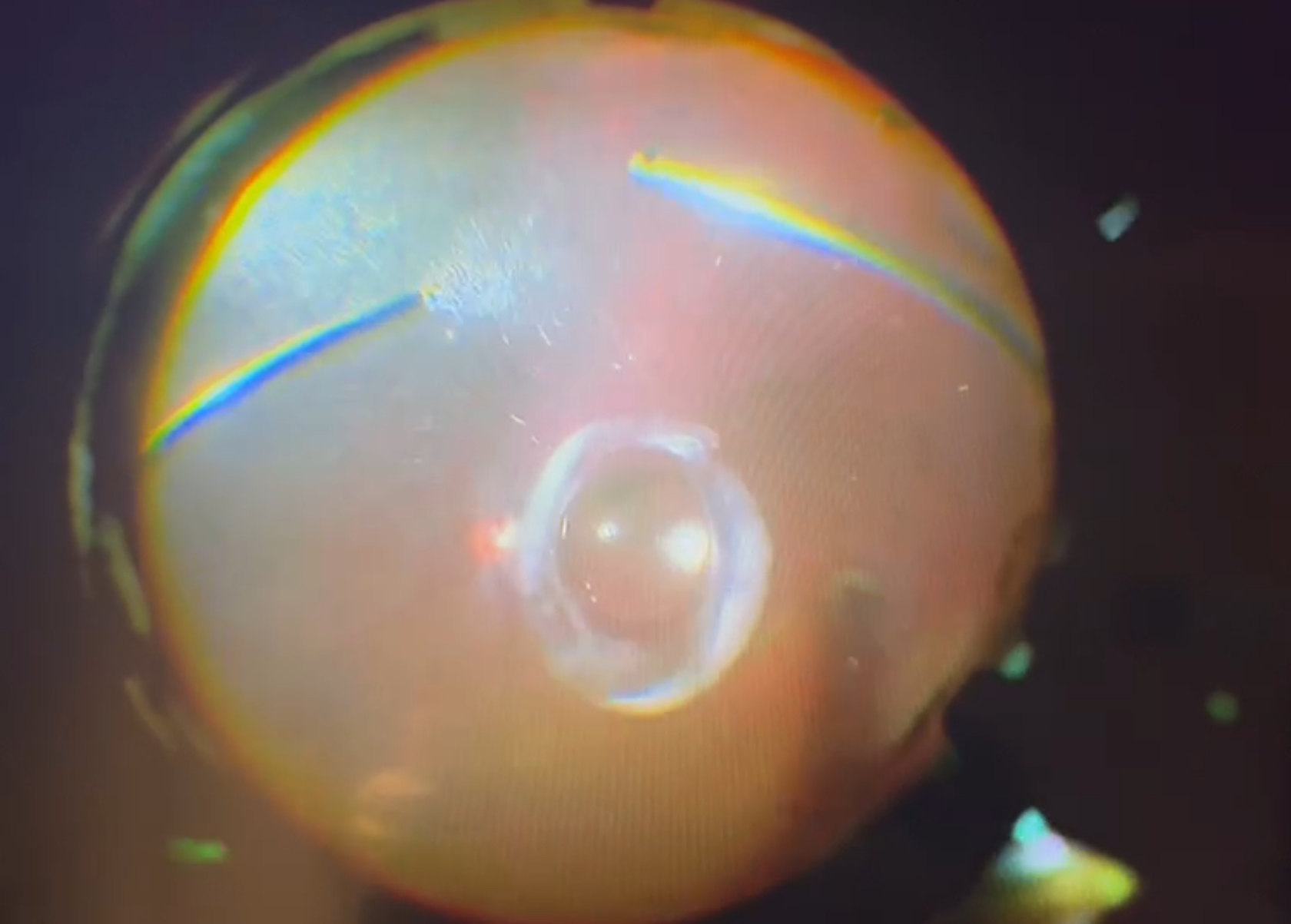 今日の硝子体手術は眼内レンズが眼の底まで落ちてしまった“眼内レンズ落下”で、レンズを回収して取り出し、新たなレンズを眼の中に固定する強膜内固定を行いました。眼内レンズの入っている水晶体嚢を支える“チン小帯”が弱くなると、レンズがズレて傾いてきてしまうのですが、通常はレンズの後ろ側に硝子体があり、後ろ側から支える働きがあるので、急にレンズが落ちてしまうことは少ないのですが、この患者さまは以前、網膜剥離で硝子体手術を受けており、硝子体がほぼ無い状態だったので、比較的、短期間でレンズ落下の状態となってしまいました。