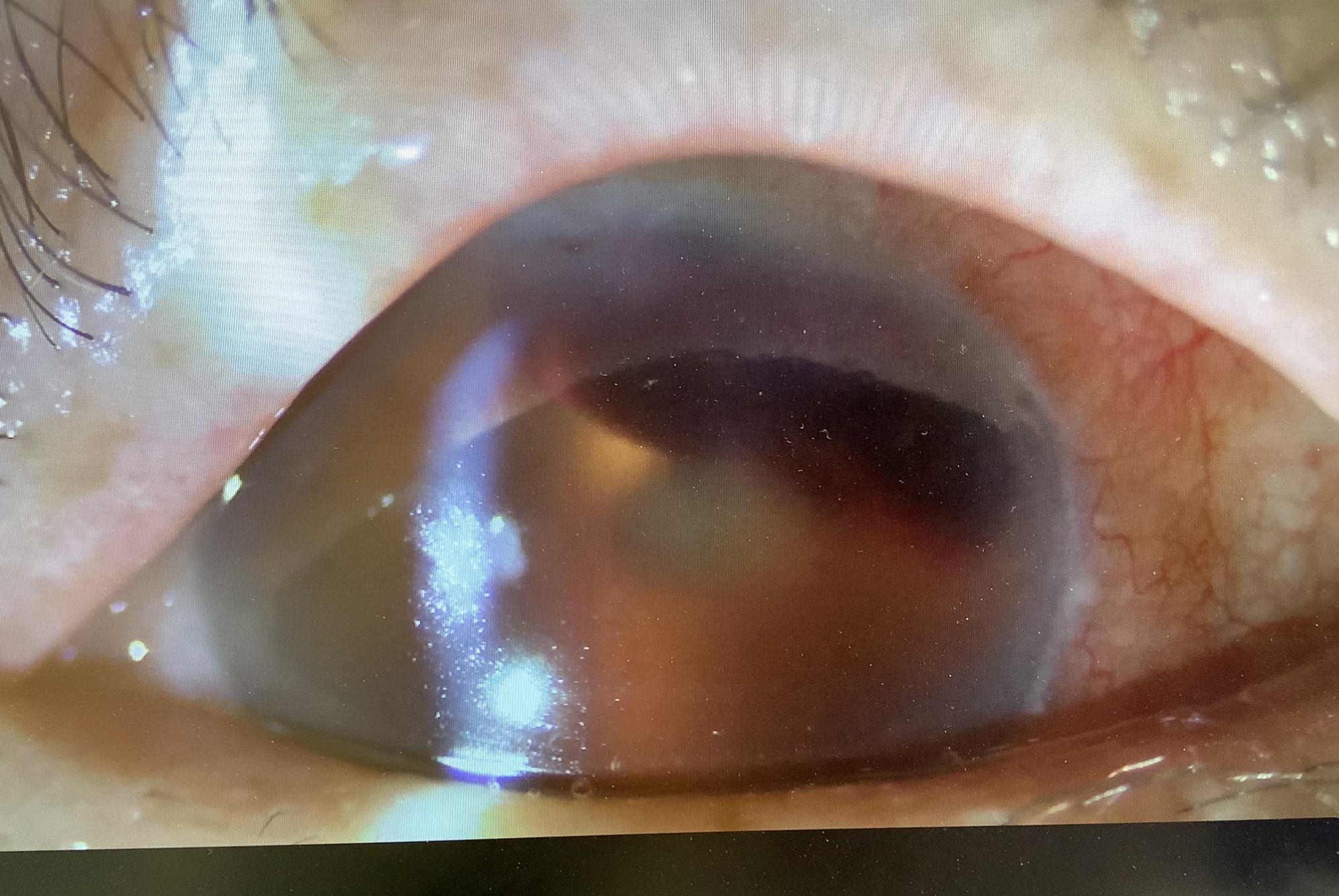昨日の眼内レンズ交換を受けていただいた87歳の男性の患者さまは、多焦点レンズから単焦点レンズを虹彩の裏側と前嚢の間に入れる“嚢外固定”を行いました。手術自体は全く問題なく終えましたが、今日の診察の際には、前房(眼の前のスペース)に出血が溜まった“前房出血”を起こしていました。古いレンズを取り出す際に虹彩に傷がついたか、嚢外固定をするために使ったのが3ピースタイプの単焦点レンズでレンズの支えが虹彩を傷つけて出血を起こしたと思われますが、レンズ自体はきれいに入っており、出血が引くのをひとまず待たせていただくこととしました。もし、なかなか出血が引かない場合や眼圧が上がってしまう時には、出血を洗う“前房洗浄”をさせていただくかもしれませんとお話しました。