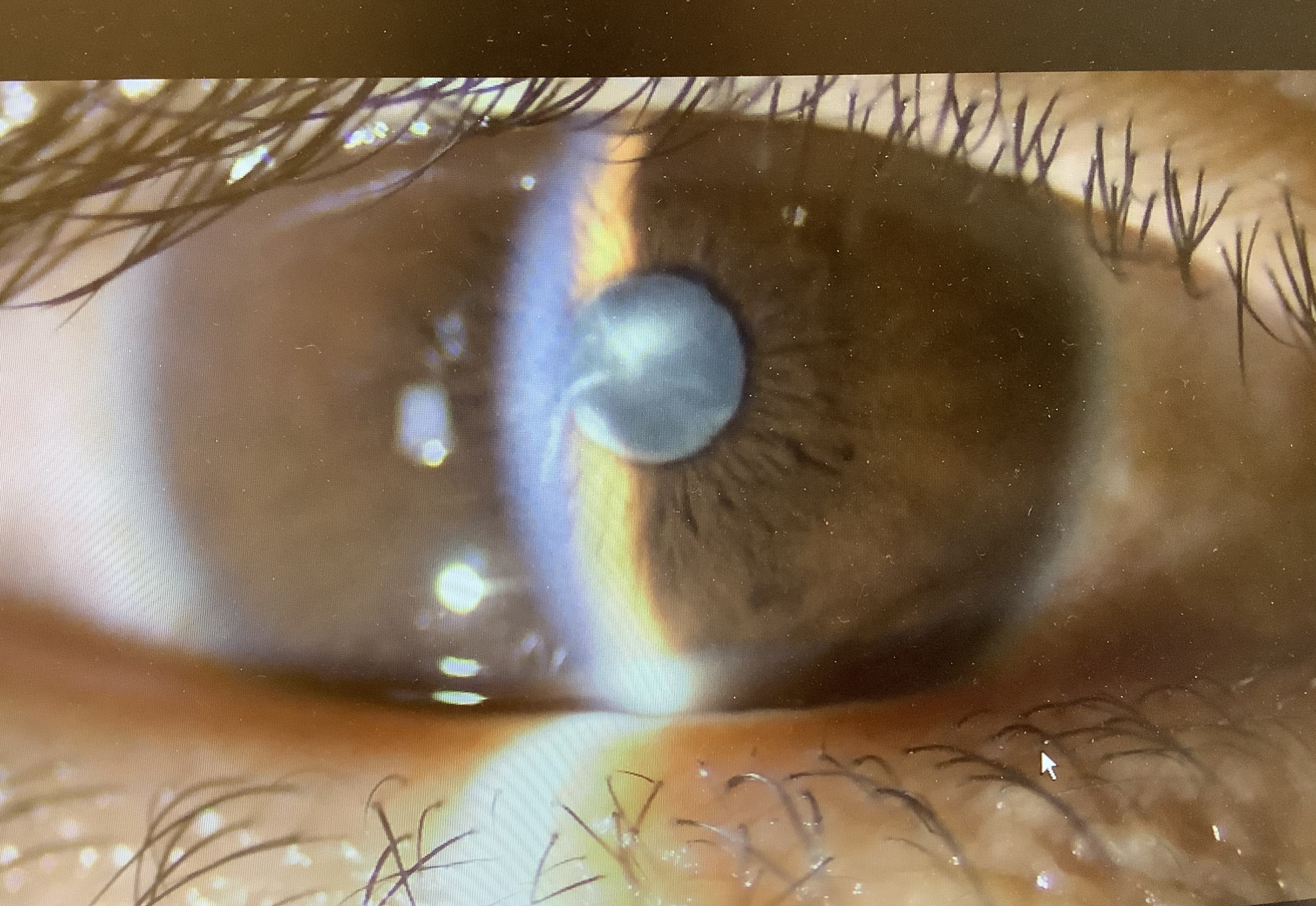 金曜日にICLの手術を受けていただいた男性から『今朝起きたら全然見えなくなっていた』と連絡を受け、急遽受診いただきました。術翌日の土曜日には、視力も1.2まで出ていて、レンズもきれいに入っていて、全く問題ありませんでしたが、今日は眼の中に炎症が強く、レンズの表面や角膜の裏側に炎症細胞が沈着し膜を作ってしまっているような状況で視力は手動弁(目の前で手の動きが分かる程度の見え方)でした。