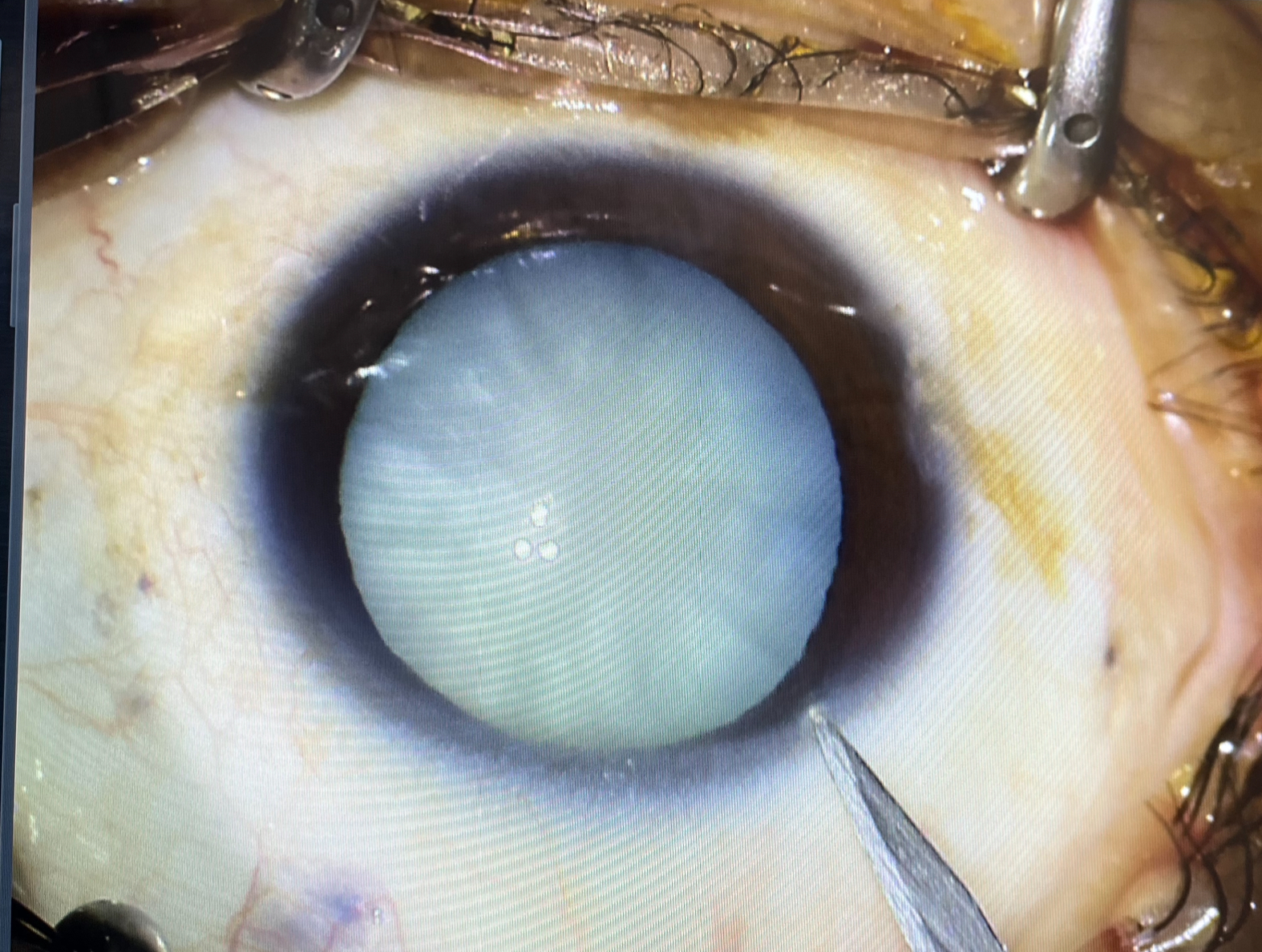 今日の白内障の手術では水晶体が真っ白けになってしまっている“成熟白内障”の患者さまがいました。成熟白内障の手術は、通常の白内障より難しいとされますが、その理由は水晶体が真っ白になってしまうと、顕微鏡の光の眼底からの反射が得られず、水晶体の袋がとても見えにくく、水晶体の前面を丸く切開するCCCという操作がとてもしにくいということがあります。