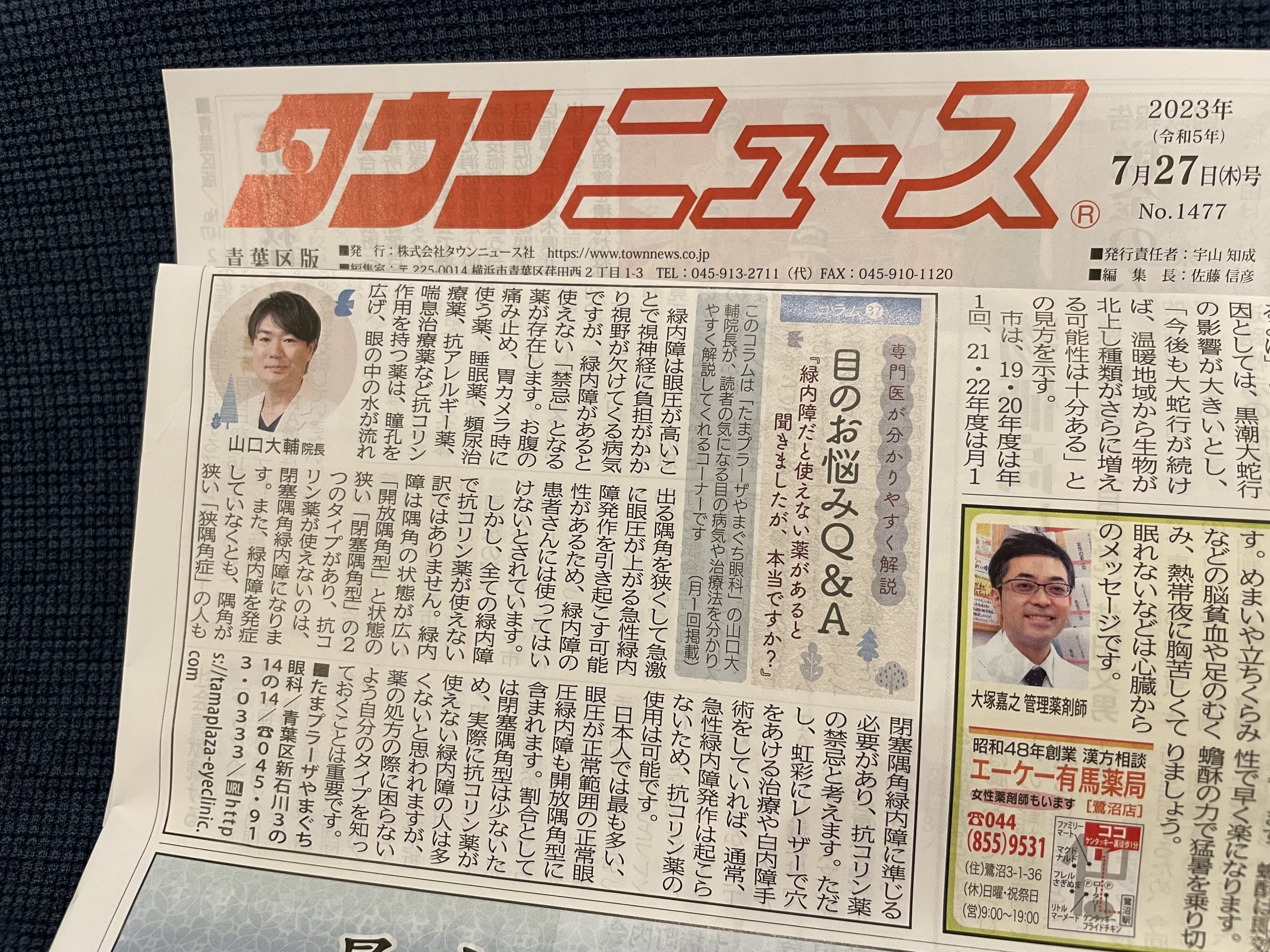 タウンニュース青葉区・都筑区・宮前区版で毎月連載させていただいている『目のお悩みQ&A』第37回目の今回は『緑内障だと使えない薬があると聞きましたが、本当ですか?』というテーマで緑内障の禁忌薬について書いてみました。