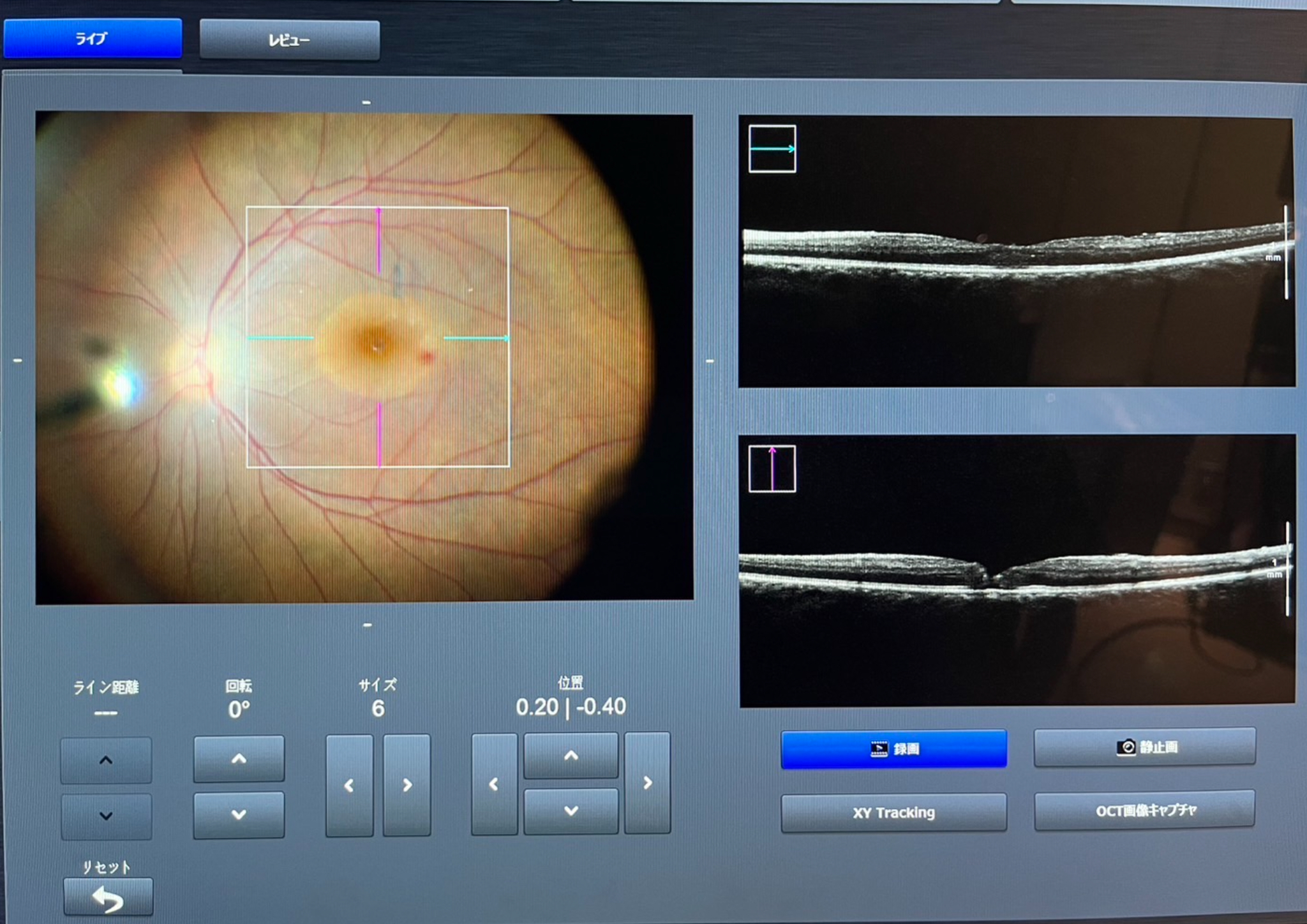 当院では手術の最中に黄斑部を評価する術中OCTの検査を行い、確認をしています。ILMを剥がして空気に換えた時点で黄斑の穴も塞がり加減だったので、この患者さまもなんとか順調に治っていただければと思います。