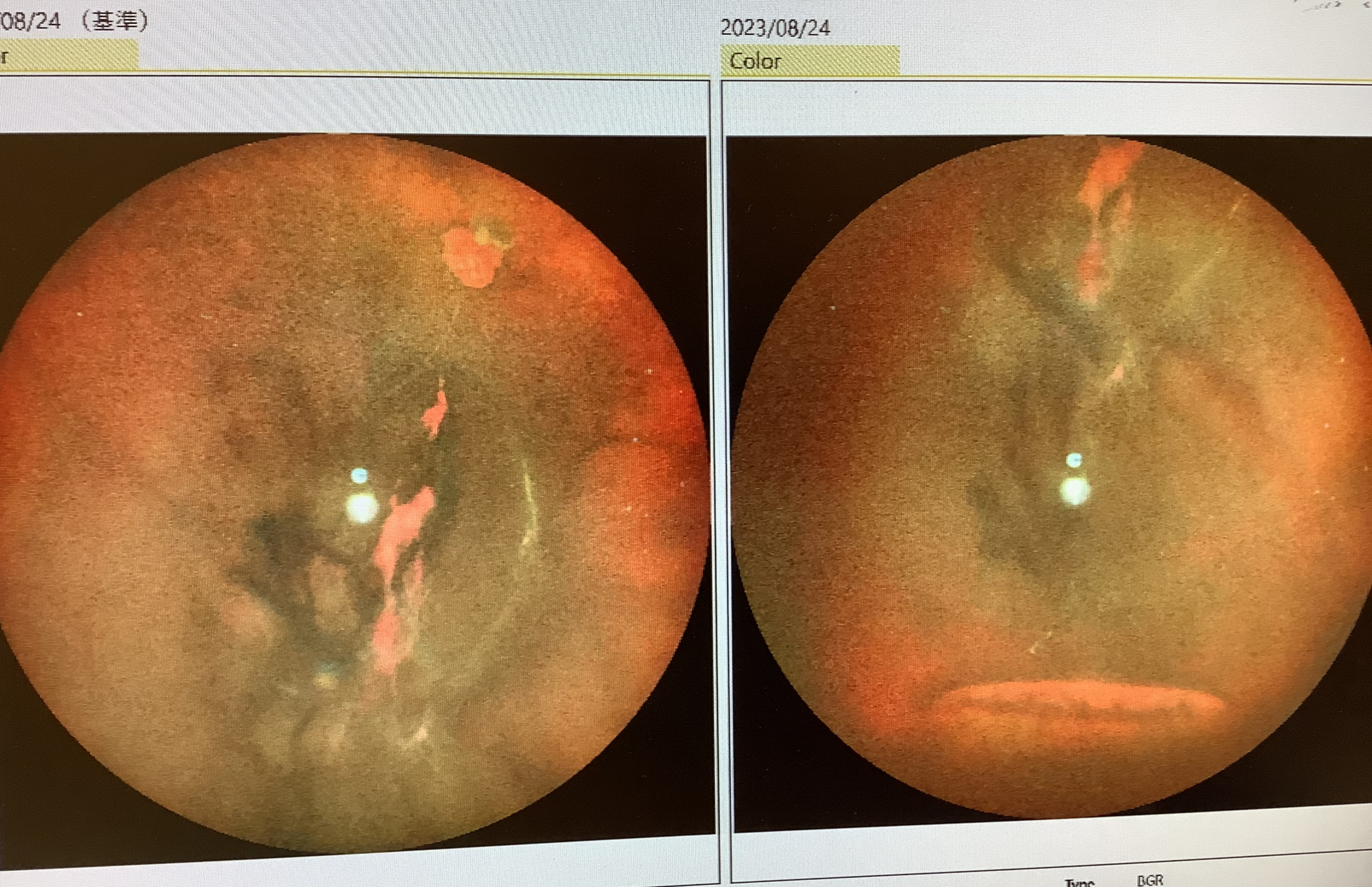 昨日、外来受診された男性は、『1週間前に飛蚊症が出始めて、昨日、急に飛蚊症が強くなり、急激に見えなくなった』といらっしゃいました。1週間前の最初の飛蚊症は“後部硝子体剥離”が起こったことで出てきた症状で、その後部硝子体剥離が網膜を引っ張り、網膜が裂け穴があき(網膜裂孔)、その時に血管も切れて硝子体出血を起こし、急激に視力が低下したと思われました。出血の量が少なく、網膜裂孔がしっかり見えて剥離の範囲が軽度であれば、レーザーで裂孔の周りを固める治療も選択になるのですが、この患者さまの場合、網膜裂孔がギリギリ分かるものの、出血の量が多く、レーザーが届かない状態であったため、硝子体手術で出血を取り除き、網膜剥離も同時に治す方針とさせていただきました。実際の手術では、出血を取り除くと、網膜の剥がれた範囲は軽度で、硝子体腔を空気に換えた後、裂孔の周りをレーザ凝固し、さいごに空気を医療用のガスに換えて手術を終えました。所々、網膜の牽引が強い箇所があり、ここもレーザー治療をしていますが、術後にここが穴となり、網膜剥離が再発することがあるので、注意が必要ですが、なんとかきちんと治ってくれるといいなと思います。