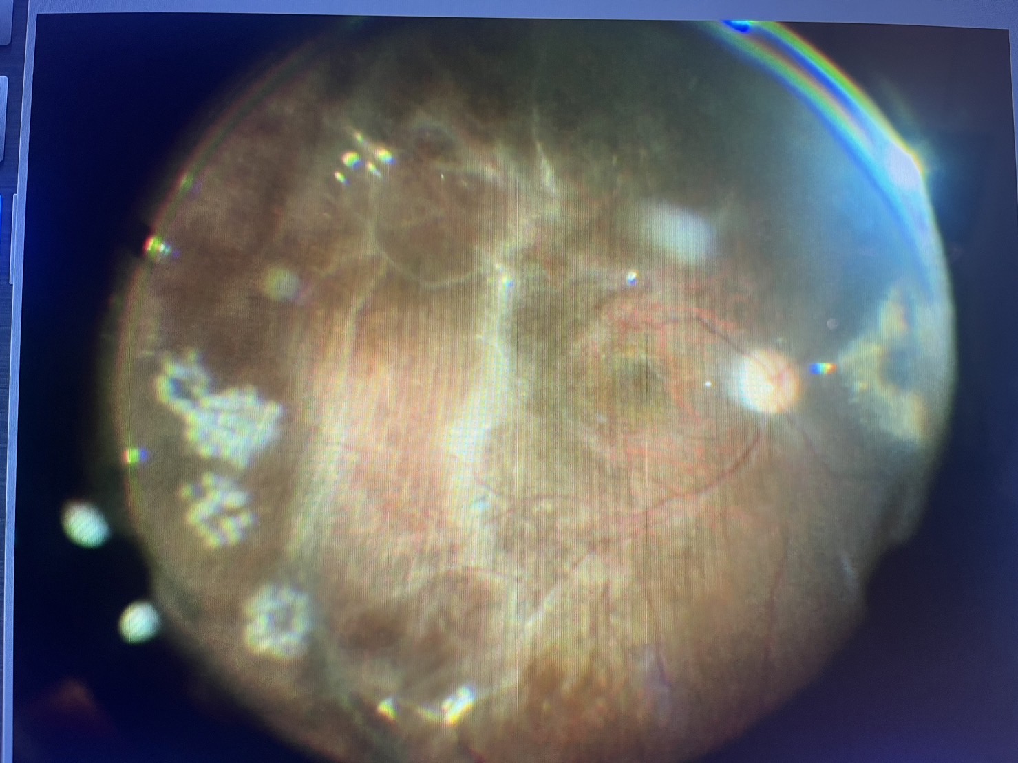 白内障が強い場合の硝子体手術の懸念点は眼底の様子が事前に分からないことで、今回もOCTという検査で黄斑の上の膜が分かっていたものの、実際に眼の中を見る眼底検査はできない程の白内障の濁りで、白内障を取って、硝子体の中に入ると、単なる年齢の黄斑上膜ではなく、おそらく、静脈閉塞症という眼底出血を起こす病気を起こし、それによって続発的に生じた黄斑上膜のような所見でした。硝子体手術では、硝子体の外側の膜を網膜から剥がしていくのですが、部分的にくっつきが強く、丁寧に剥がしたものの、2〜3か所、網膜に小さな穴があいてしまったため、レーザーで穴の周りを固め、念のため、眼の中をガスに換えて手術を終えました。予想外の眼底所見で、思ったより時間がかかってしまいましたが、白内障が強かったり、硝子体出血などで眼底が分からない場合の手術は、色々な可能性があり、開けてびっくりとならないように、しっかり術前の説明をし手術に備えようと改めて思いました。