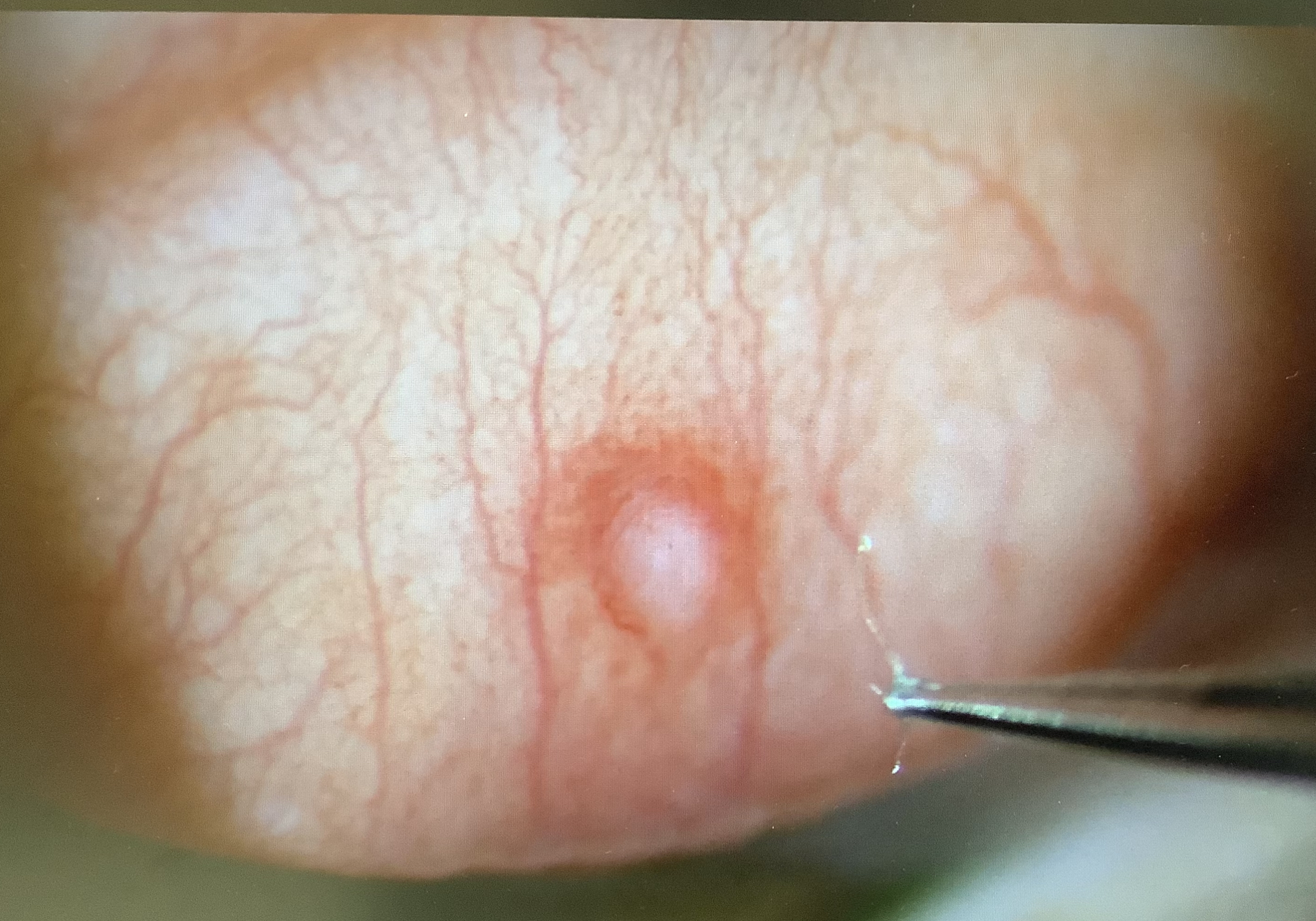 今日の外来では、30代の男性が、『2か月前から左眼がゴロゴロして、瞬きをすると痛い』という症状で、2週間前に他院を受診したところ、“ドライアイ”と言われ、点眼を出されたものの、改善しないため来院されました。確かにドライアイでもおかしくない症状ではありましたが、症状が具体的ではっきりしているとこと、点眼でも全く改善しないということで、なんとなく何かありそうな気がしたので、染色してみると、角膜(黒目)の上の部分に擦り傷のようなキズがあり、まぶたの裏側をめくって見てみるとポツっと赤い膨らみがあり、『もしかして、まぶたの手術、二重の手術を前に受けていますか?』と伺うと、『はい』というお答えで、点眼麻酔をした上で、そのポツっとした盛り上がりの中を探ると、糸が出てきました。“ゴロゴロする”という症状はドライアイでもよくみられる症状ではありますが、この患者さまのように、“まばたきをする時に痛い”という時は、まぶたの裏側に何かできている、もしくは何かある(異物が入っている)ということがたまにあります。特に、埋没法の二重手術を受けた方は何年かして糸が切れて、まぶたの裏側に糸が出て、角膜の表面に糸が当たり擦れて痛みや異物感が出るので、もし心当たりのある方は、まぶたをしっかりめくって診てもらうとよいと思います。ただ、普通にしている時は糸が出ていても、まぶたをめくってしまうと、引っ込んで、糸の確認ができない場合もありますが(今回もまぶたをめくった状態では糸は見えませんでした)、通常、まぶたの粘膜面の変化を伴うので、所見から原因を疑うことはできるかと思います。