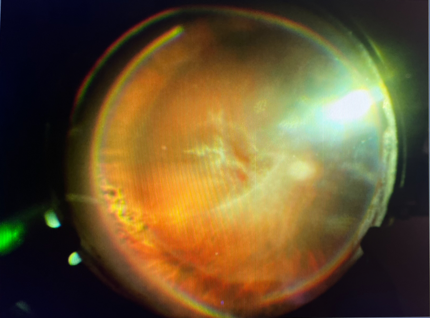 今日の硝子体手術の73歳の男性の方は、当院の職員のお父さまでした。元々、右眼の硝子体出血があったのですが、白内障もそれなりに進行していたので、11月にまずは白内障の手術を受けていただきました。しかし、白内障を取ってみると、硝子体出血の量も多く、視力もわずかに改善したのみでした。幸い、その後の左眼の白内障の手術の後は、視力も十分改善し、それほど不自由もなかったため、患者さまの希望も踏まえ、しばらく保存的に経過を見る方針とさせていただきました。ただ、出血の原因がはっきりしなかったので、あまりそのままにしておくのもよくないのと、やはりなかなかこのままでは出血が引きそうになかったので、今回、出血を取る硝子体手術をさせていただきました。出血を取ると、白くなった血管(白線化血管)とその周りにレーザーの跡があり、網膜静脈閉塞症が原因の出血と思われ、網膜剥離や加齢黄斑変性などの悪い原因での出血ではなく、このまま出血がひいてくれれば、視力も期待できそうだったので、よかったです。ただ、白線化血管の上に膜が形成され、それを取り除こうとしたら、膜の中にできた血管から出血が起こり、熱凝固して止めましたが、術後にジワジワ出血することがあるので、注意して経過をみていきたいと思います。