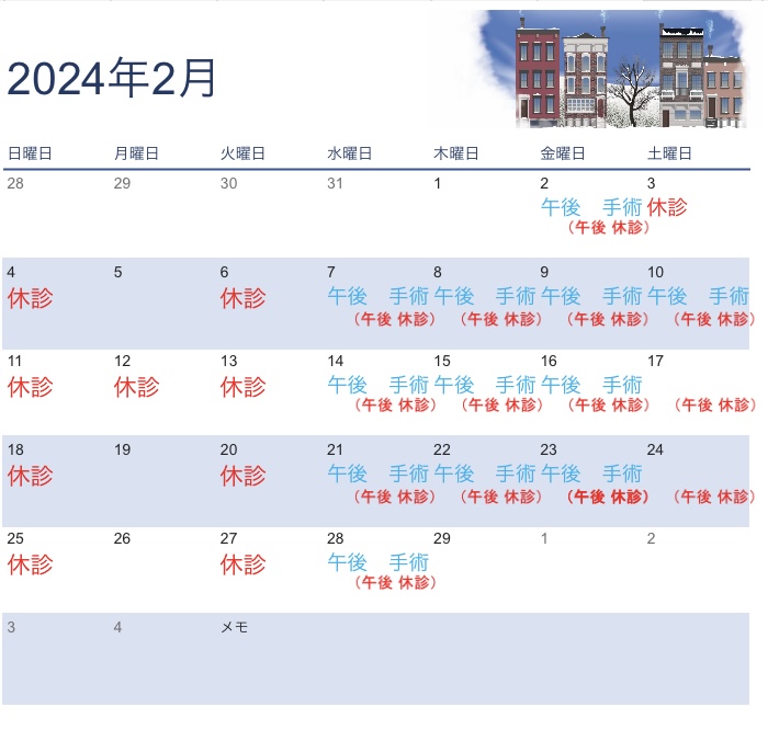 毎週水曜、木曜、金曜の午後は手術の予定となっております。