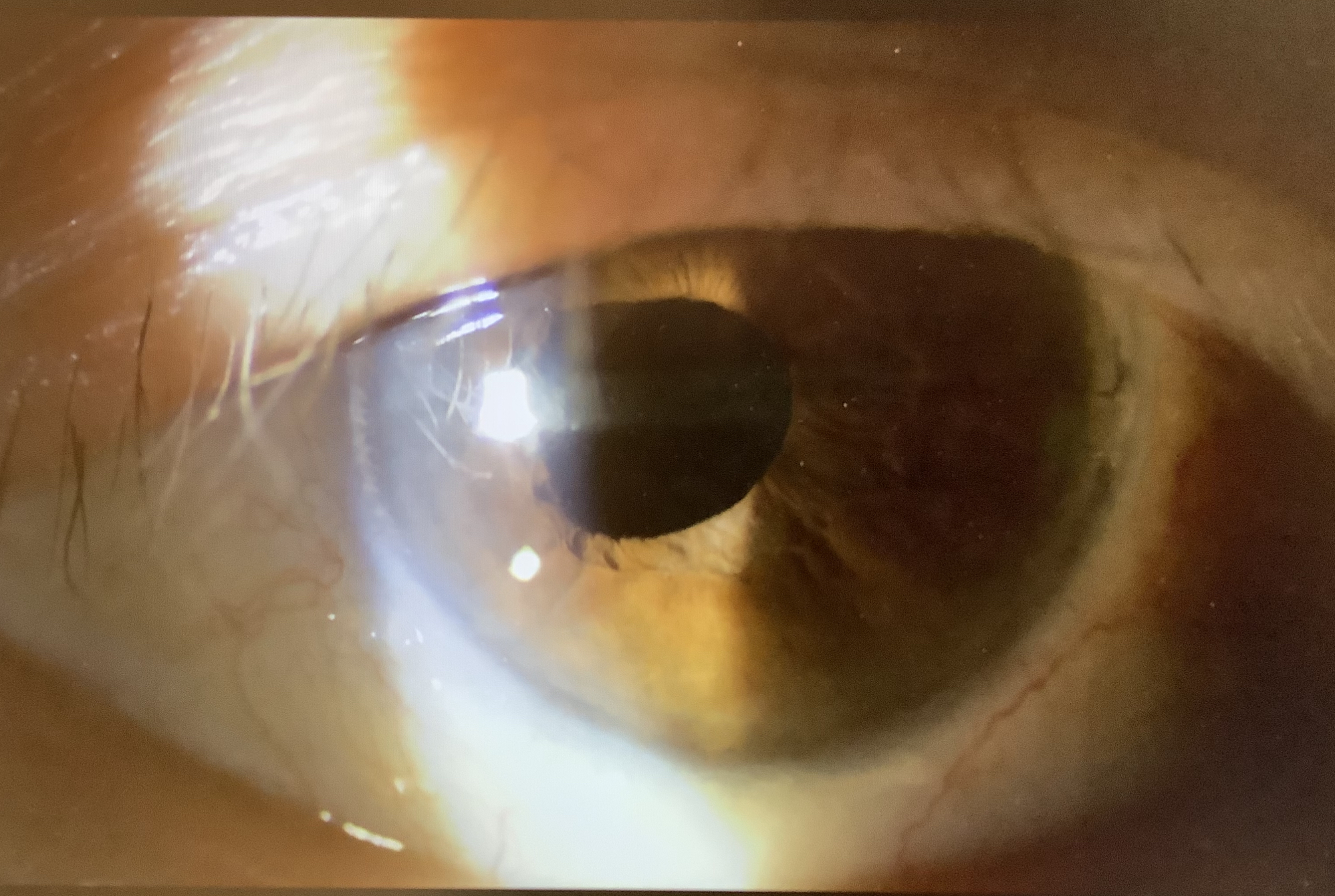 硝子体切除という手術の申し込みになった80代の男性の方は、12月に他院で白内障の手術を受けたものの、『右眼がどの距離も見えにくい』という症状で本日、来院されました。白内障の手術で入れた眼内レンズ自体はきれいに入っていましたが、視力は裸眼0.08で、矯正しても0.5までしか改善が得られませんでした。ただ、“ピンホール”という小さな穴から見るような条件での視力検査は矯正で0.9まで改善し、見えにくいと感じる理由の一つは、瞳孔が開いてしまっていることと思われました。なぜこのように瞳孔が拡がってしまっているかというと、本来は眼内レンズの裏側にある硝子体がレンズの脇から眼の前のスペースに出てしまい、耳側の傷に嵌頓してしまっていることが原因と思われました。その脱出した硝子体を切除することで、瞳孔の閉じ方が完全に回復するかは不明な部分はありますが、硝子体が出てきてしまっていることもよくないですし、それを取ることで瞳孔が閉じ、視力が出てくれるようになれば、一番手間のかからない対処法として、前房内の硝子体を切除して瞳孔が小さくなってくれることを期待して手術を行う方向とさせていただきました。もちろん、この処置で十分な改善が得られないこともあり得ますが、その時は、虹彩を縫って瞳孔を縮める方法を行うか考えたいと思います。虹彩縫合は眼にとって、ちょっと負担になってしまうこともあり、虹彩縫合をしないに越したことはないかと思い、効果が期待できる選択肢の中でまずはより侵襲の少ない処置から行っていきたいと考えました。