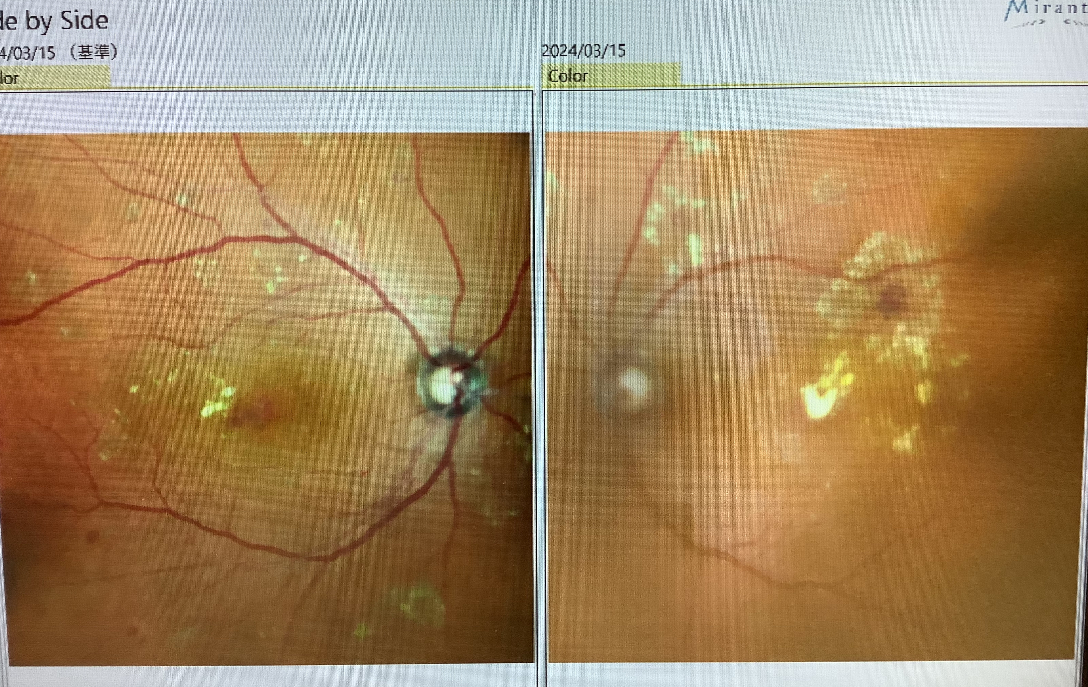 今日の患者さまの場合、網膜の中心部の黄斑部に浮腫などの滲出性変化はみられず、白内障の手術を行なってもよいかと思われましたが、術前検査の血糖値の結果によっては、内科の治療を早めに行なってもらおうと思います。