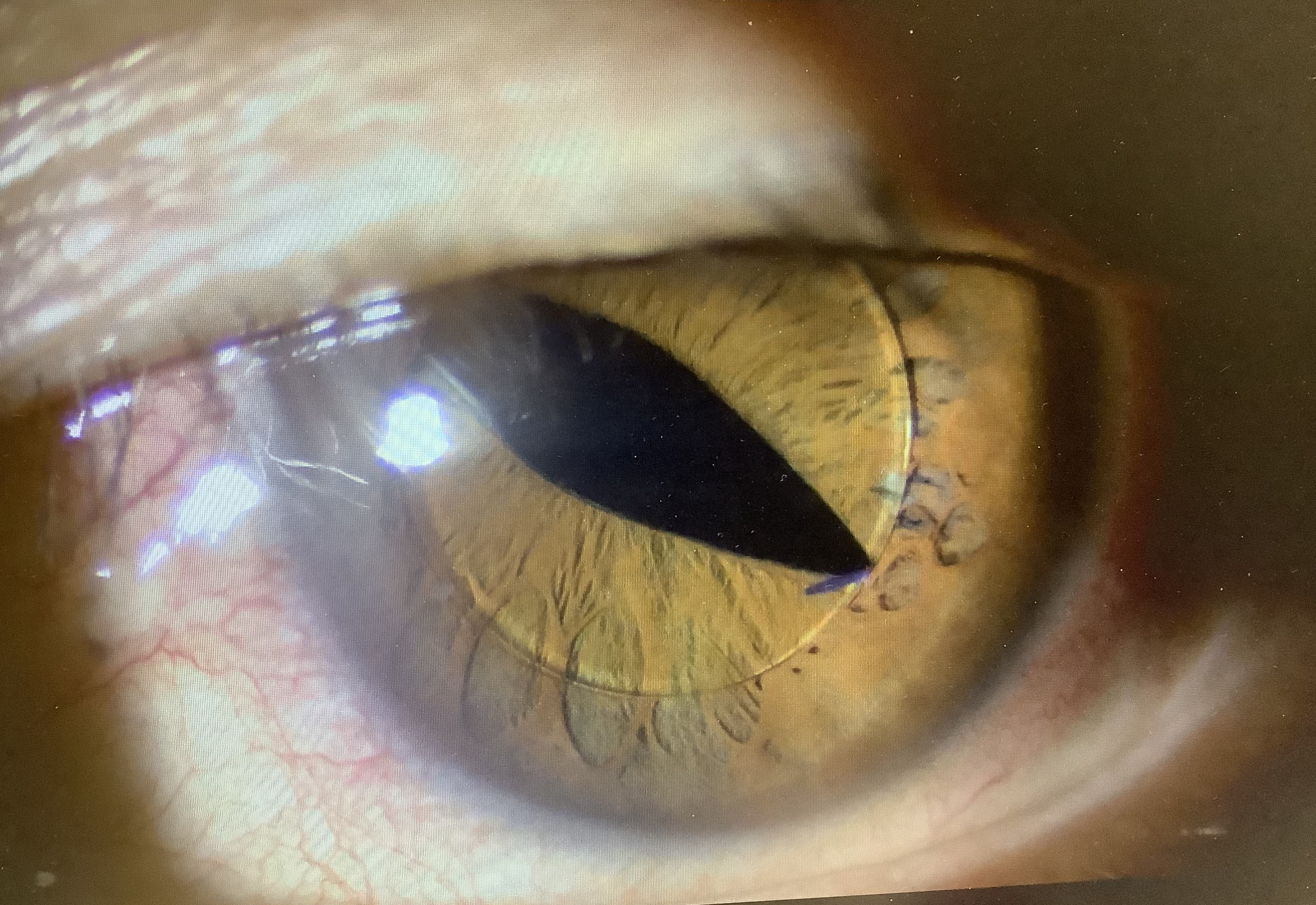 予定の手術を順調に終えようとしていた頃、その患者さまが来院され、『見え方がよくなって、治ったかもしれない』と報告を受け、手術の合間に診察させていただくと、眼内レンズがきれいに虹彩の後ろ側に戻り、本当に治っていました。完全に眼内レンズが虹彩の前面に出てしまうほどの虹彩捕獲では、外科的な処置が必要と思っていたので、驚きでしたが、無理に何か処置を行うこともないかと思われ、その患者さまの手術は中止とさせていただきました。瞳孔を閉じるような縮瞳作用のある点眼を使い、経過を見させていただくこととしました。また起こってしまい繰り返すようなら再度、手術を考えたいと思いますが、これでもう虹彩捕獲が起こらないでくれればいいなと思います。
