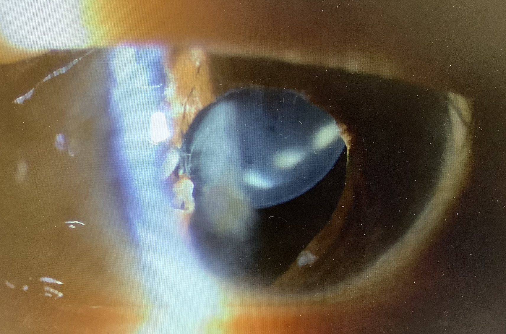 この患者さまは3年くらい前から見えにくさを感じていたようで、今日、診させていただくと、経年変化なのか、下方の瞳孔が拡がっており、ピンホール(小さな穴)から除く視力検査では自覚的な改善が得られ、瞳孔の散大が症状の原因と思われましたので、再度の虹彩縫合を予定させていただきました。外傷後で難しい手術が予想され、谷口教授のようなきれいな手術はまだまだできませんが、少しでも見え方がよくなるように頑張りたいと思います。