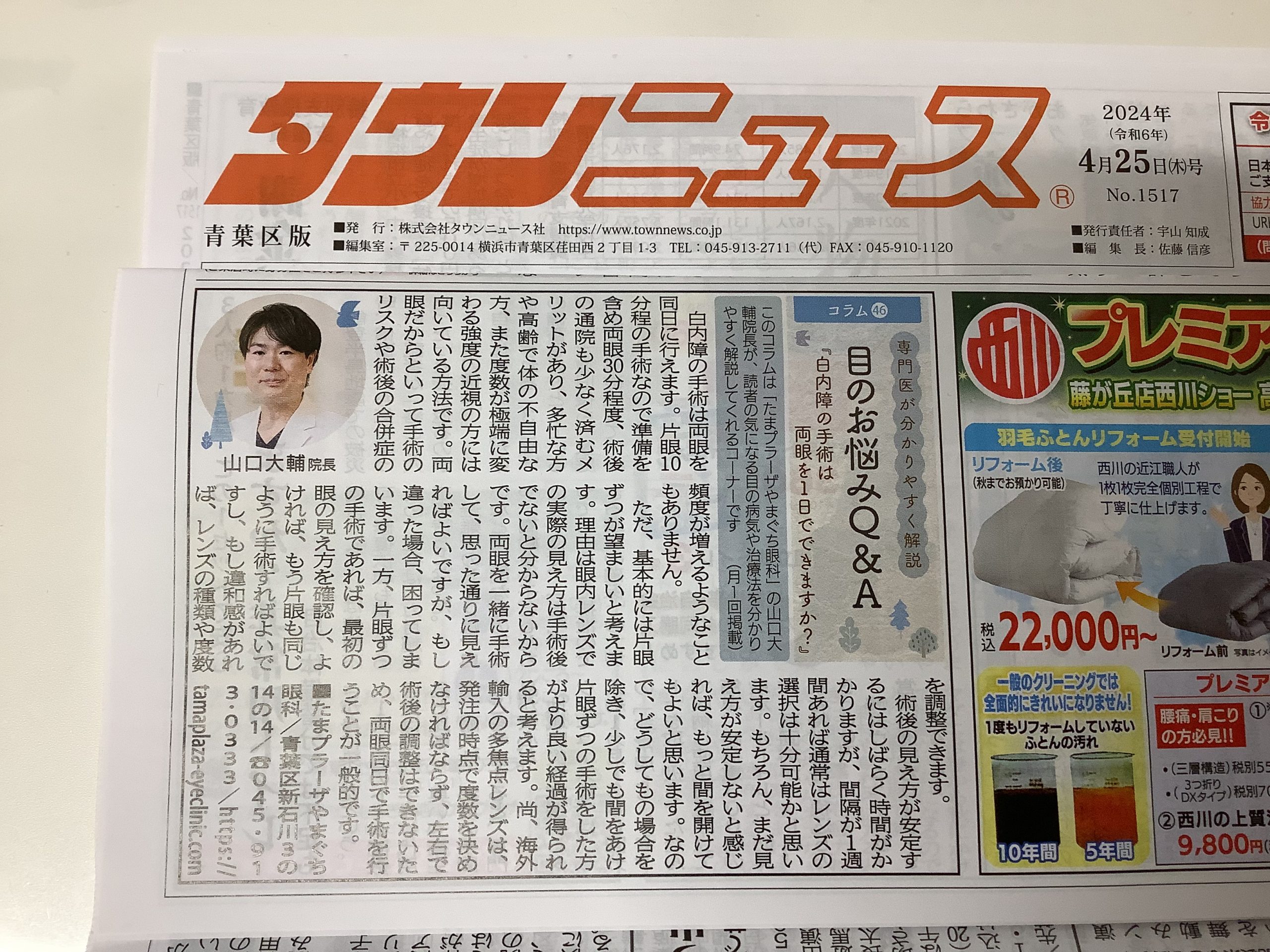 タウンニュース青葉区・都筑区・宮前区版で毎月連載させていただいている『目のお悩みQ&A』第46回目の今回は『白内障の手術は両眼を1日でできますか?』というテーマで白内障の手術を両眼同日で行うこと別々の日に行うととのメリットとデメリットについて書いてみました。