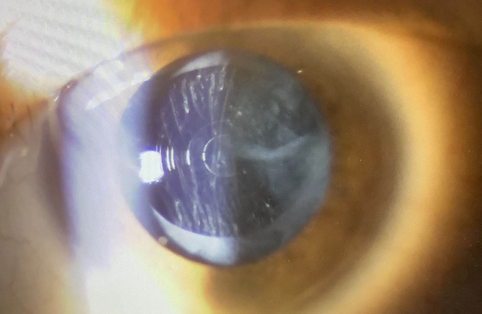 元々、強度近視で手術では多焦点レンズ(シナジー)を入れたところ、すっきり見えず、近くも見えにくいということで、単焦点に入れ換えることを希望されたそうですが、主治医の先生からは『安全に入れ換えられる時期が過ぎてしまった』と言われ、困って来院されたそうです。よく患者さんからも『入れ換えは術後何ヶ月までできますか?』と聞かれることはありますが、術直後でもちょっとしたことで問題になってしまうこともありますし、術後数か月、数年経っていてもうまく入れ換えができることもあります。ただ、時間が経っていた方が入れ換えが難しい場合もあるので、そういう意味で安全にできないと言われたのだと思いますが、そのリスクは承知の上で、入れ換えを希望されたものの、結局断られたそうです。
