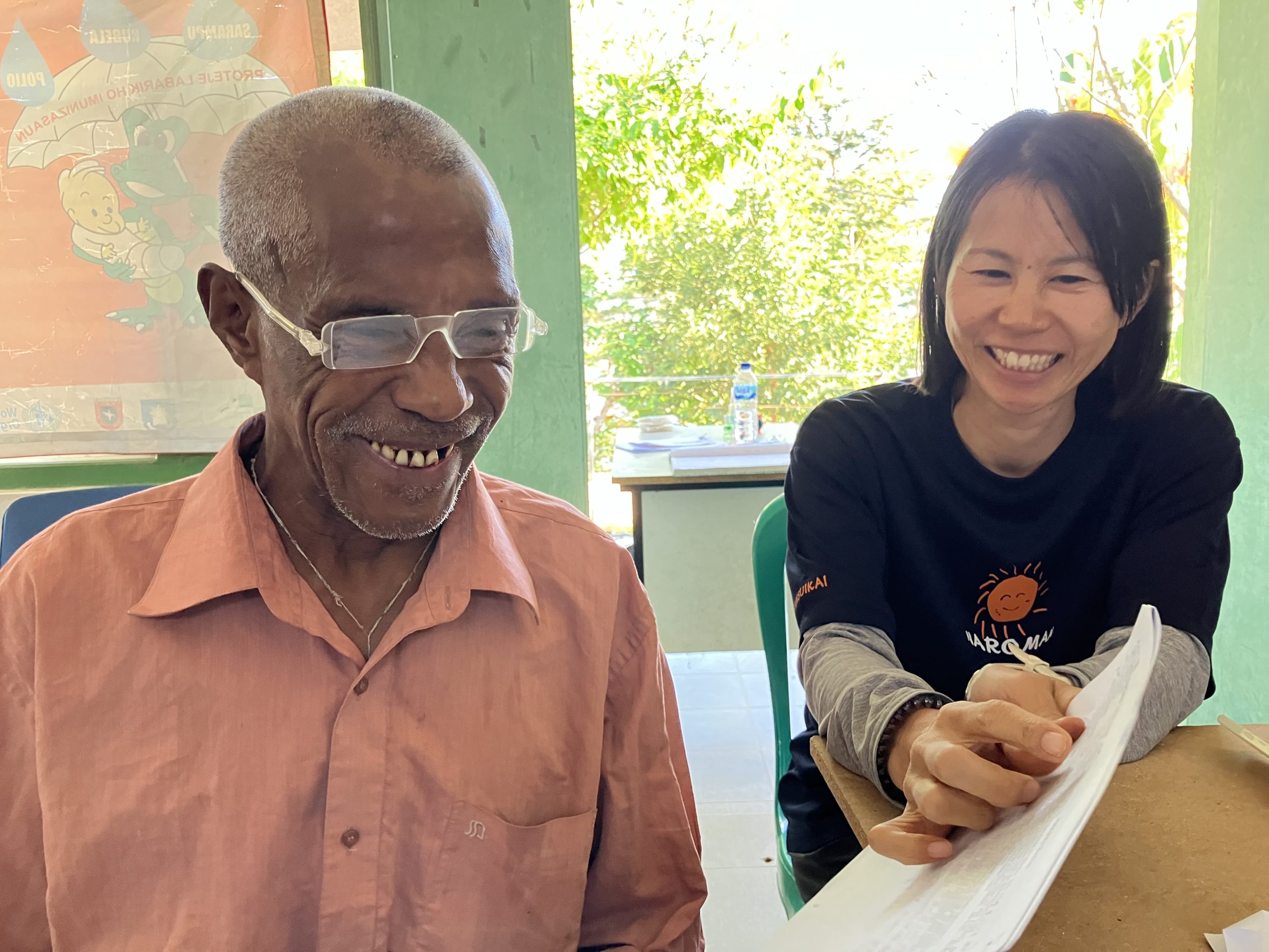 この日は58名の診察をしましたが、診療といっても、屈折スクリーニングと診察と、できることは限られ、日本からの使わなくなった老眼鏡の配布と白内障の手術適応患者さんに『手術した方がいいですよ』と伝えることがメインでしたが、『手術しない』という考えの人も多く、そもそも、手術可能なDiliの国立病院へ行くのも本当に困難なことが実感できました。でも、老眼鏡には喜んでもらえました。寄贈してくださった皆さま、どうもありがとうございました。
