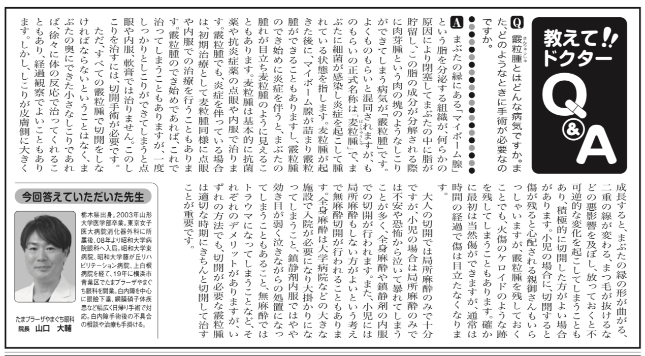 神奈川新聞の『教えて‼︎ドクター Q&A』のコーナーで質問に答えさせていただきました。今回は霰粒腫についてです。新聞でお読みいただいた方もいらっしゃるかもしれませんが、記事の内容をブログにも転載させていただきます。いつも『いい質問ですね!』と思うことを聞かれるので、皆さんの参考になるとうれしいです。