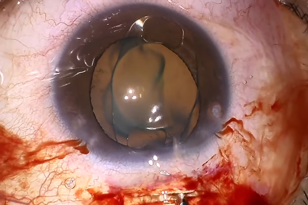 上方(頭側)に外方4mm、内方6mmの切開を作り、レンズの虹彩の固定を外し、レンズを摘出し、このキズは白内障の手術をするには大き過ぎるので、縫合して閉鎖し、白内障手術用のキズを耳側に新たに作り、水晶体の濁りを取り出し、眼内レンズを入れて手術を終えました。この患者さんは2か月前に同様に左眼の手術をしており、今回が2回目だったので前回よりも半分くらいの時間(それでも20分くらいかかりました)でスムーズに手術できてよかったです。前回は大きな切開創が閉じにくく、虹彩が嵌頓してしまい、術後に虹彩の整復と創の縫合の再手術が必要になってしまいましたが、今回は再手術の必要なく順調に経過してくれるといいなと思います。