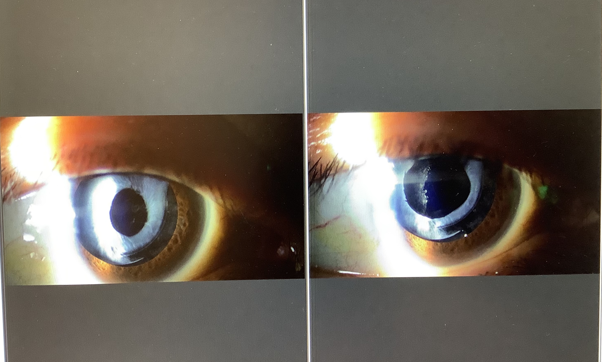 初回の手術の時には、水晶体嚢は柔らかいので、切れ込みを入れれば、あとは引っ張ることで拡げることができるのですが、術後しばらくすると、水晶体嚢は硬くなってきてしまうので、そうはいかず、眼内用の剪刀(ハサミ)で少しずつ切開して拡げました。そもそも、前嚢が収縮してきても、よっぽどでなければ、見え方には影響はないと思っていますが、実は、左眼の方が前嚢収縮が強く、既に2年ほど前に前嚢収縮切除をして、見え方が改善していました。その後、右眼も少しずつ見え方が悪く感じるようになってきたため、今回、手術を行うこととしました。