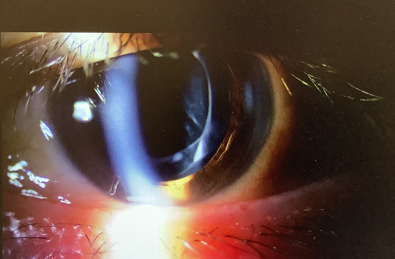 外側に影が見るような見え方は、Negative dysphotopsia(ND)の症状と思われ、術後の経過で自然によくなることもありますし、もし積極的によくするならば、径の大きな7mmレンズに換えるかですが、ピントが合わないような見えにくさは、おそらく乱視が残っていることが原因で、これを改善するには乱視矯正のトーリックレンズを使う必要がありますが、7mmレンズにはトーリックタイプがないため、もしレンズの入れ換えを行う場合には、NDの改善か、見え方の改善かどちらかを優先しなければなりません。今回、患者さんは見え方を改善したいということで、トーリックレンズへの入れ換えを予定させていただきました。ただ、若干、水晶体の支えが弱そうな所見や癒着が強めな印象もあり、入れ換えが難しい可能性もあり、乱視の改善には必ずしも入れ換えが唯一の治療方法でもないので、実際の手術で入れ換えが難しそうな場合は、無理をせず撤退して、改めて他の治療を考えましょうとお話しさせていただきました。