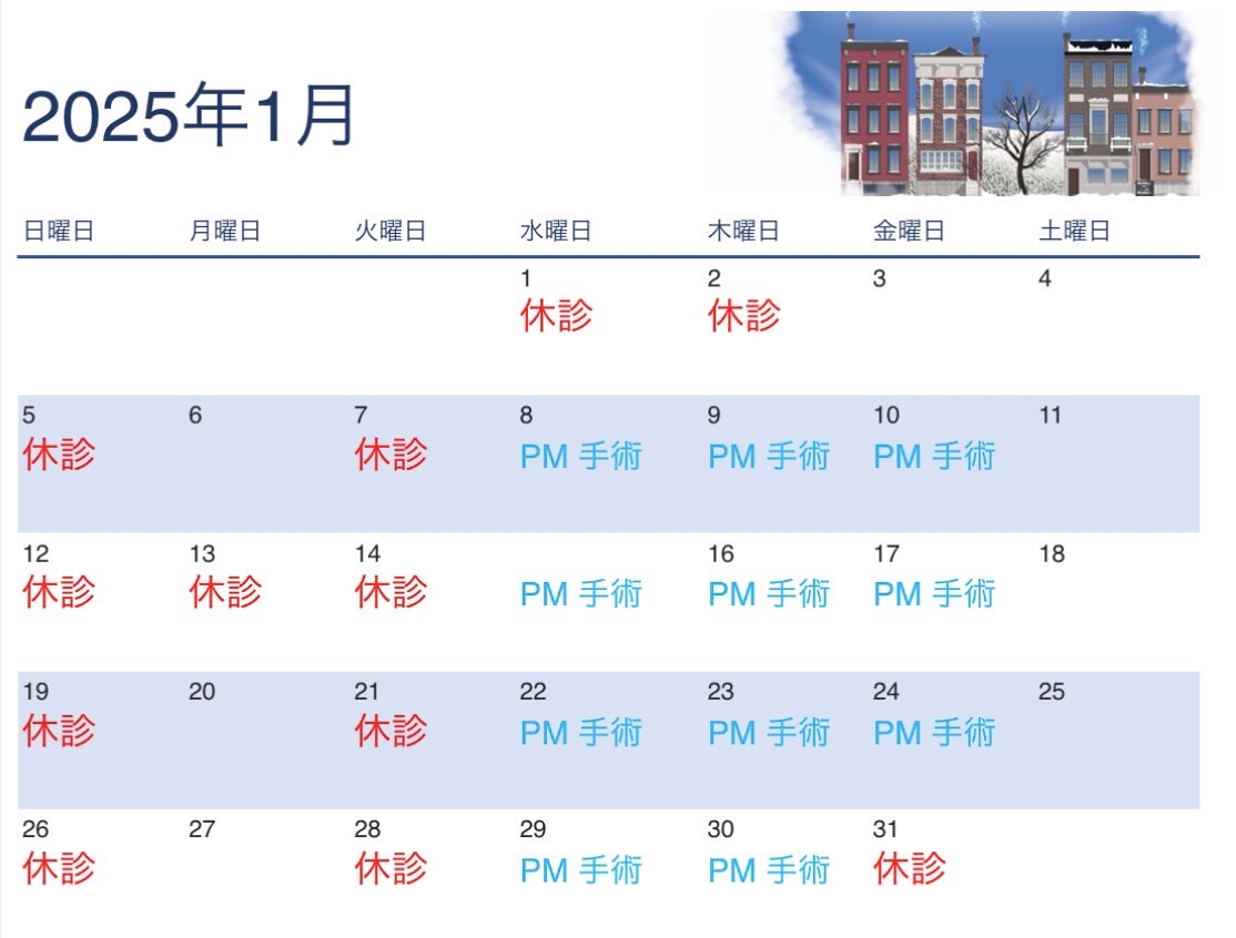 年始は5日までお休みをいただき、1月6日(月)から診療を始めさせていただきます。手術は8日(水)から始める予定となっております。よろしくお願いいたします。