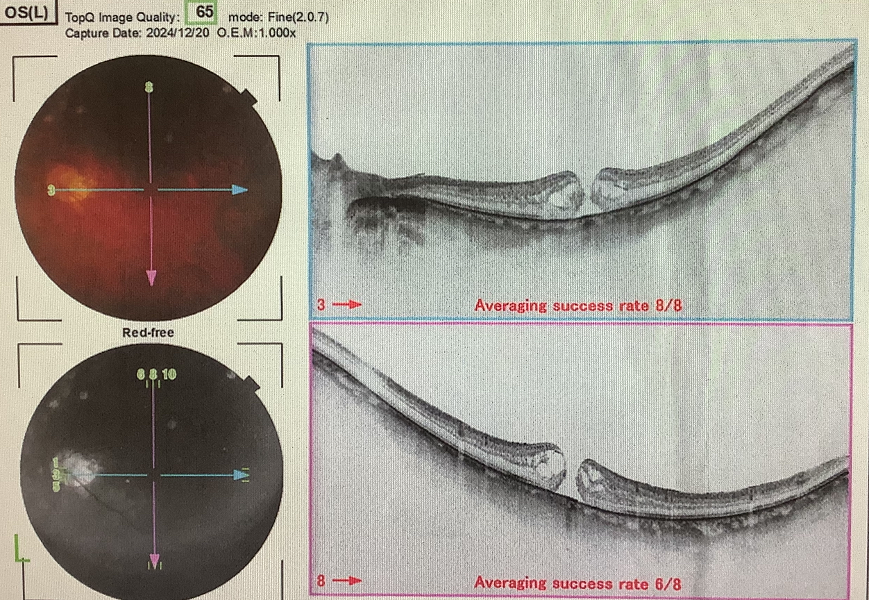 黄斑円孔は網膜の中心部の黄斑に穴があいてしまう病気ですが、今日、黄斑円孔で硝子体手術の申し込みをいただいた70代の男性の方は、1か月前くらいから左眼の中心部の歪み、見えにくさを自覚され、お近くの眼科を受診し、黄斑円孔の診断を受け、手術のために他の眼科を紹介され、受診したところ、手術が3か月近く先になるということで、もう少し早めに手術した方がよいのではと心配になり、当院を受診されました。黄斑に穴があいた状態が長く続くと、穴になっていた部分の網膜の細胞が悪くなってしまい、穴が塞がっても見え方の回復が弱くなってしまうので、基本的にはあまり先にせず、準緊急的に手術をした方がよいと考えています。なので、約1週間後の来週水曜日に手術を予定させていただきました。手術は、硝子体手術で、硝子体を切除した後、黄斑部の網膜の一番内側の内境界膜(ILM)を剥がし、眼の中を一旦、空気に置き換え、更に空気を医療用のガス(SF6ガス)に置き換えるというような処置を行い、ガスの浮力で黄斑部の穴を押さえつけることで穴が塞がることを期待する手術になります。ガスは少しずつ吸収され減っていきますが、なるべく効果的にガスを使うにはうつ伏せもしくは下向き姿勢でガスをなるべく眼の真裏の黄斑にあててあげることが大切です。このうつ伏せ姿勢はちょっと辛いのですが、よりよい経過のためには必要で、術後2日間が特に重要といわれているので、しっかり頑張っていただければと思います。