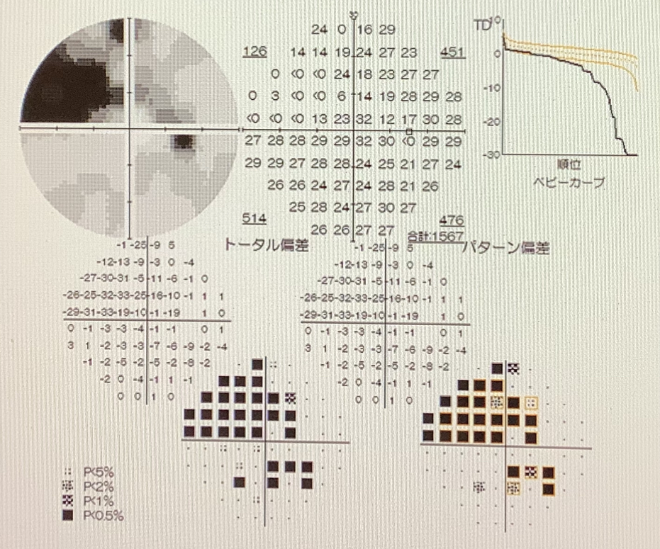 近視が強い人では、眼の構造的に視神経乳頭の陥凹が大きく見えることもあり、視野検査を行っても何も異常がないこともありますが、この方の場合、実際に右眼は中心部の周りに弓状の視野欠損を認め、また、その視野欠損に一致して、網膜が薄い所見(NFLD;網膜神経線維層欠損)があり、緑内障による変化と考えられました。
