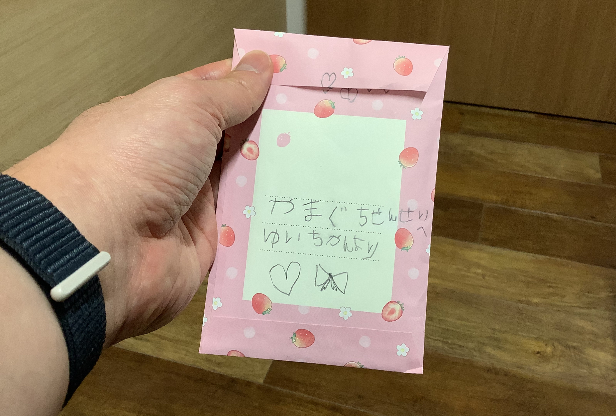 それから、今日は先週、霰粒腫の切開をした5歳の女の子の抜糸がありました。抜糸は、そんなに痛くはなく、糸を引っ張る時にちょっとチクっとする程度なのですが、怖くなってしまう子もいてどうかなと思っていましたが、頑張って泣かずにできてよかったです。診察が終わった後には手紙をくれました。こちらこそ、頑張ってくれてありがとうです。