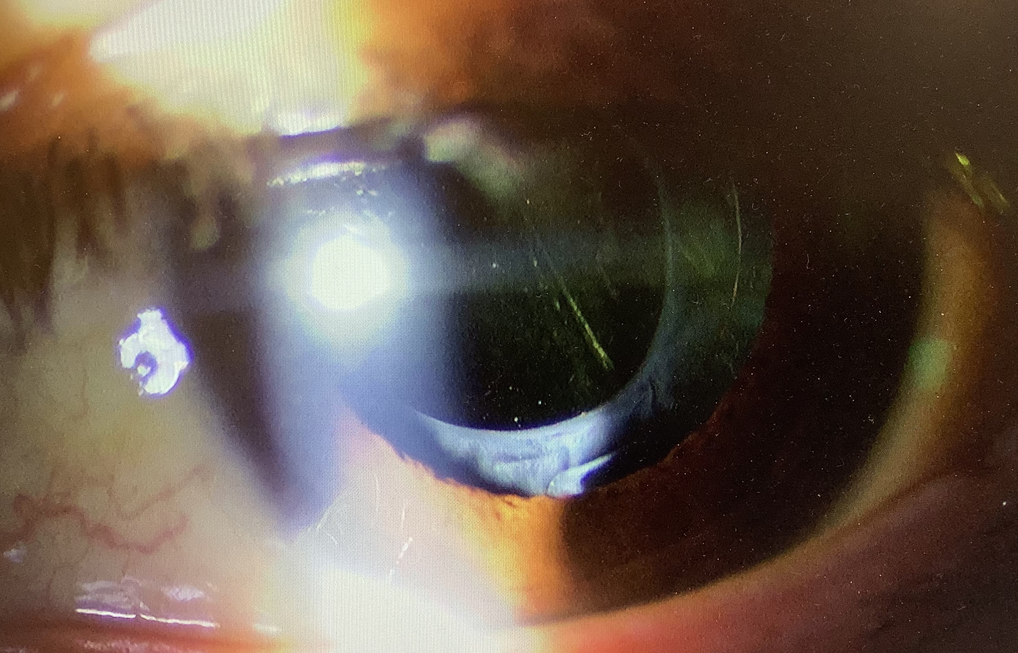 昨日の手術では、パンオプティクスからアイハンスへの入れ換えがありました。レンズの入れ換えでは、まず水晶体嚢にレンズが癒着しているので、これを粘弾性物質(OVD)を使って剥がしますが、この方の場合、前嚢とレンズがぴったりくっついてしまっていて、通常使う鈍針では隙間ができなかったので、鋭針を使って強制的に前嚢とレンズと間を剥がし、その隙間からOVDを注入し、剥離を進めました。