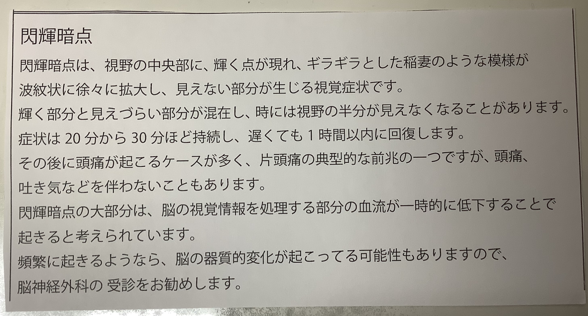 実は僕時々、閃輝暗点の症状が出てくるので、慣れてしまっていますが、多分、初めてこの症状が出た人は驚くと思いますし、特別受診しないといけない状態ではありませんが、心配して眼科や脳外科を受診したくなる気持ちも分かるなと思います。