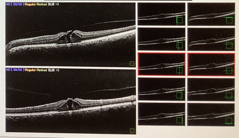術後1.2あった視力は0.3まで低下し、左眼の中をみると、黄斑部に穴が開いている“黄斑円孔“という状態でした。歪みを生じる病気はいくつかあり、急を要さないものもありますが、この黄斑円孔はあまり放っておくとよくない病気です。治療としては手術(硝子体手術)が必要になりますが、時間が経ち過ぎてしまうと、手術で穴がきれいに塞がっても視力の改善が乏しいこともあります。なので、準緊急的に来週、手術を予定させていただきました。