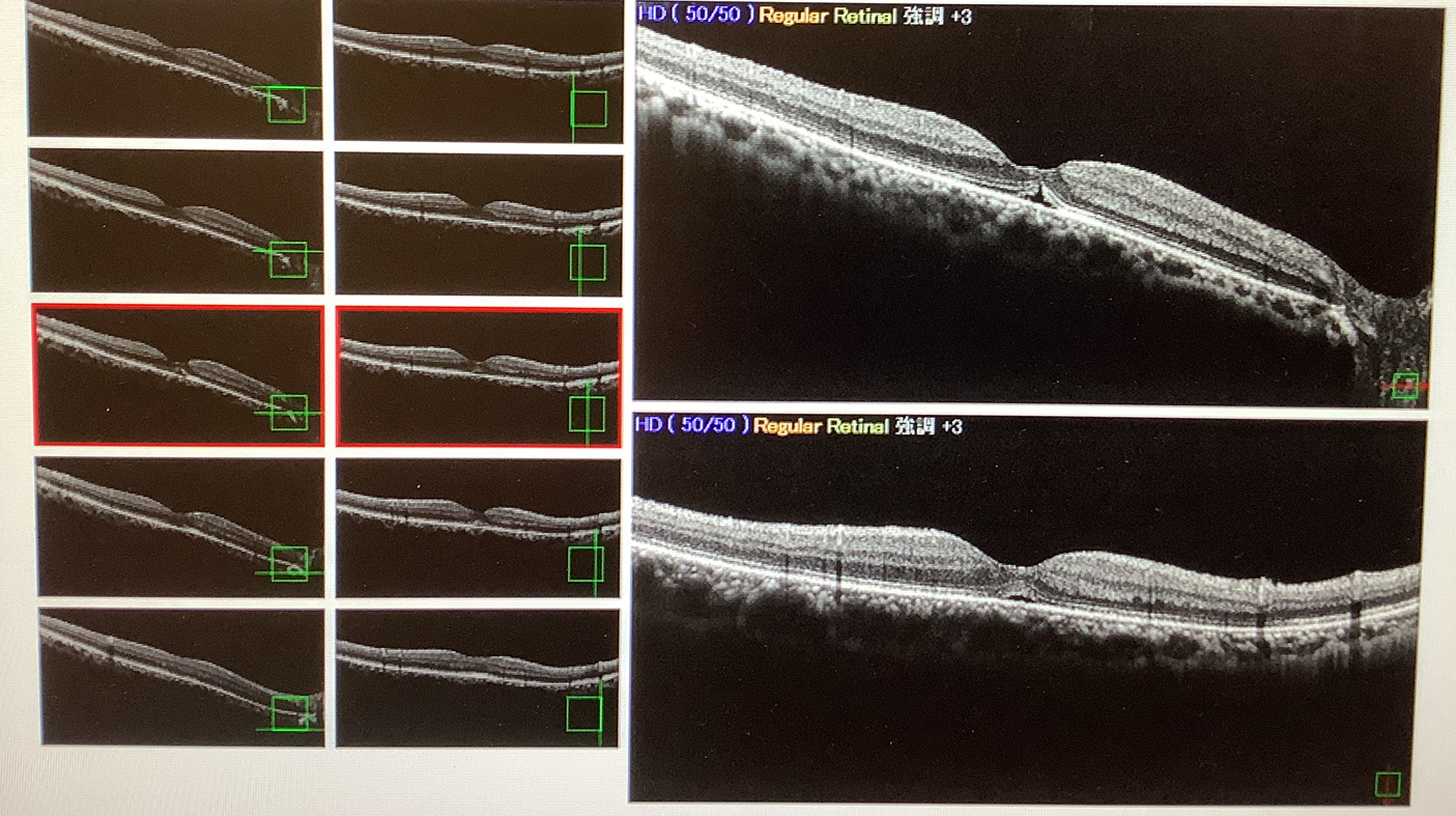 今日、黄斑円孔で手術を受けていただいた50代後半の女性の方は、約5年前に右眼の網膜剥離で硝子体手術を行い、再発もなく順調に経過し、最近は半年月ごとに定期的に経過観察を行っていました。ずっと問題なく経過していたのですが、5月の定期受診時に本人の見えにくいという自覚症状と検査上の視力の低下があり、OCTの検査では、黄斑部にわずかに穴ができそうな(細胞の層の断裂?)所見がありました。黄斑に穴があくのは黄斑円孔という病気ですが、硝子体手術の後の黄斑円孔は経験がなく、硝子体がないので黄斑への牽引も生じにくく黄斑円孔は起こりにくいのかなと思い、1か月様子を見ましたが、悪化はないものの、症状も続き、視力も下がったままだったので、黄斑円孔に準じて、再度の硝子体手術で、網膜の最内層の内境界膜を剥がし、ガスを入れて黄斑部の穴の閉鎖を狙った手術を行わせていただきました。硝子体手術の後の黄斑円孔は珍しいような気がしますが、なんとか穴が塞がって少しでも視力が改善してくれるといいなと思います。