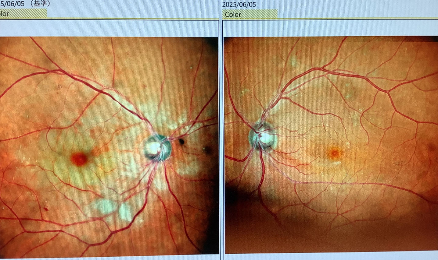 今日、予定外で外来を受診された60歳代後半の男性の方は、当院で白内障の手術と眼瞼下垂の手術を行い、糖尿病があるために定期的な眼底検査を行っていましたが、2週間前から右眼が急に見えなくなったといらっしゃいました。糖尿病があっても網膜症は全くない眼だったので、症状だけでは原因がはっきりしませんでしたが、視力は まで低下し、眼底を見ると、眼の中心の黄斑部が赤く周りが白い“cherry red spot“という所見が見られました。これは網膜の虚血が起こり黄斑部の色調が目立つことで出てくるのですが、”網膜動脈閉塞症“という病気に特徴的な所見です。網膜の動脈が詰まってしまうと網膜が壊死してしまいますが、網膜動脈に血栓が詰まることで起こるので、発症から2日以内であれば、血栓を溶かす薬剤を点滴する治療が有効な場合があります。しかし、2週間も経ってしまうと、なかなか対処法がなく、反対の眼に同じようなことが起こらないように、血液が固まらないような薬を予防的に飲むような治療をしていくくらいになってしまいます。
