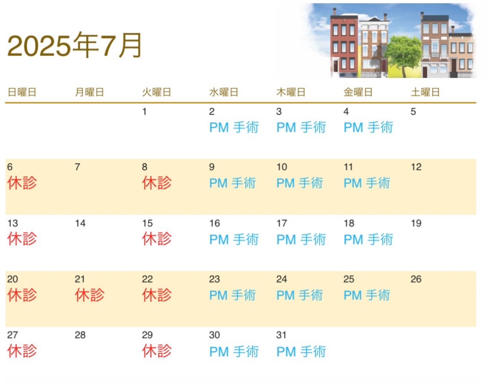 今月は学会参加と病院見学、職員旅行のため、7/12(土)、25(金)、26(土)を休診とさせていただきます。ご迷惑おかけしますが、よろしくお願いいたします。