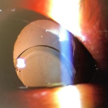 今日、眼内レンズ偏位で強膜内固定の手術の申し込みをいただいた60代半ばの男性の方は、約2年前に当院で白内障の手術を受けていただきましたが、右眼は乱視矯正のトーリックレンズが術後すぐに回転(軸ズレ)してしまい、軸修正の処置を行なった経緯がありました。軸修正を行なった後にも、またレンズが回転してなかなか乱視矯正はうまくいかないものの、レンズ自体の偏位はなく経過していましたが、ここ最近、右眼は光が下の方に伸びるような見え方をしており、レンズがズレているような気がしていたそうです。実際、右眼は眼内レンズが下方に偏位してしまってレンズの摘出と新たなレンズの挿入が必要な状況でした。