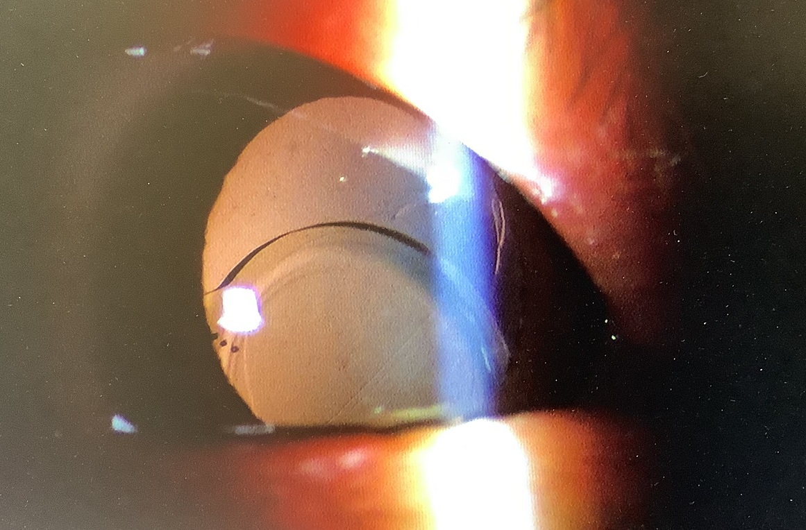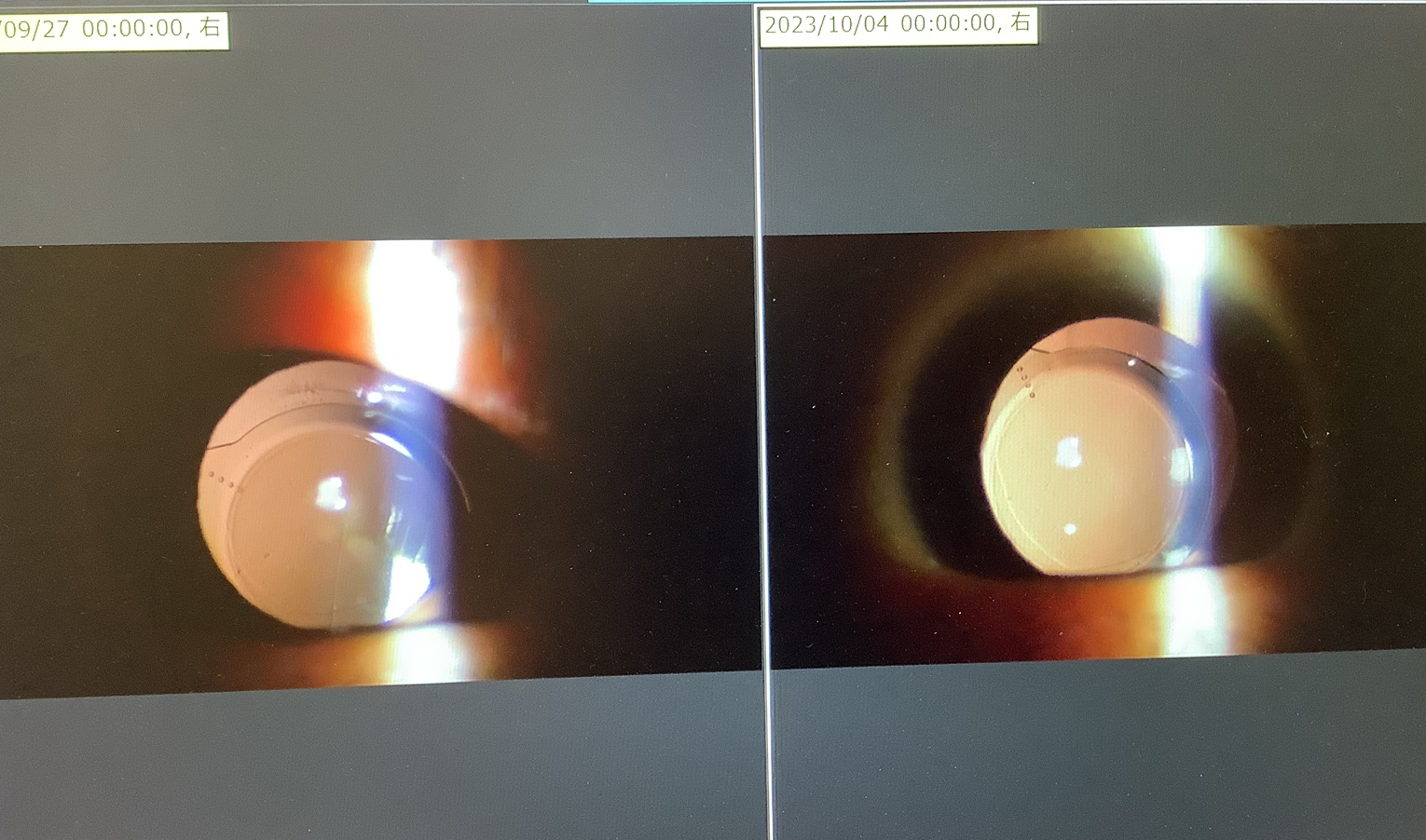 今日、眼内レンズ偏位で強膜内固定の手術の申し込みをいただいた60代半ばの男性の方は、約2年前に当院で白内障の手術を受けていただきましたが、右眼は乱視矯正のトーリックレンズが術後すぐに回転(軸ズレ)してしまい、軸修正の処置を行なった経緯がありました。軸修正を行なった後にも、またレンズが回転してなかなか乱視矯正はうまくいかないものの、レンズ自体の偏位はなく経過していましたが、ここ最近、右眼は光が下の方に伸びるような見え方をしており、レンズがズレているような気がしていたそうです。実際、右眼は眼内レンズが下方に偏位してしまってレンズの摘出と新たなレンズの挿入が必要な状況でした。