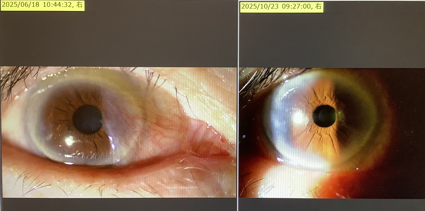 この患者さんは初診時に、翼状片と白内障があり、視力への影響は白内障の方が強いと思われましたが、先に白内障の手術をして、その時の眼の状態に合ったレンズを入れて、見え方がよくなったとしても、その後、翼状片が進行すれば見え方は変わってしまうこともありますし、それから翼状片の手術をしても眼の状態(角膜のカーブ)が変わり、せっかく白内障の手術でぴったり合わせたレンズが結果的に合わない状態となってしまうこともあります。そのため、この方もまず翼状片の手術をして1か月ほどして状態が落ち着いたところで眼の検査を行い、翼状片が取れてその落ち着いた眼に合ったレンズを選び、手術を行いました。初診が6月で片眼の白内障の手術を終えるまでに4か月もかかってしまいましたが、裸眼視力で0.7(矯正視力1.2)とひとまず右眼は良好な経過でよかったです。早く見えるようにしたい気持ちはあったことでしょうが、我慢して一つずつ段取りを踏んでいくことは重要だと思いました。