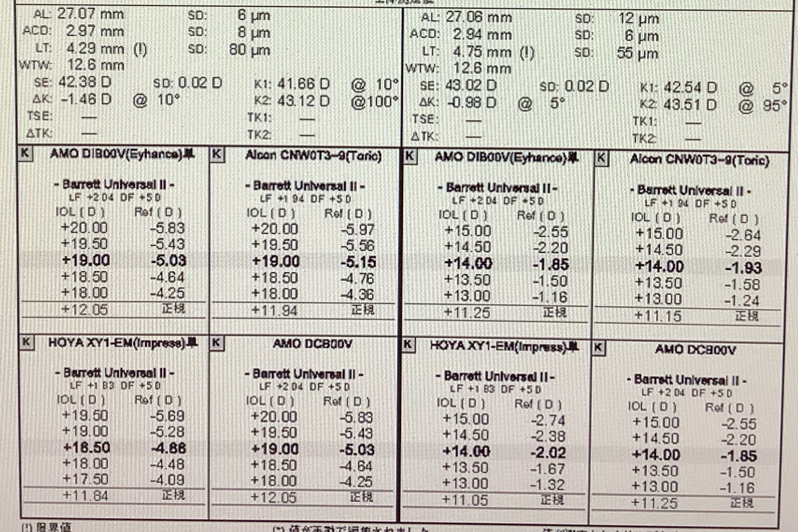 今日の外来で昨日、右眼の白内障の手術を受けていただいた50代後半の女性の方の術後翌日の経過観察がありました。この方は元々、-5Dの強度近視で先週、先に左眼の手術を近方合わせで行いました。ところが、術後に『この距離が見えないです』と言われてしまい、目の前15〜20cmの距離が見えにくくて困るということでした。近方に合わせる距離としては30〜40cm程度にすることが一般的ですが、パソコンを見る人は40〜50cm、台所仕事は50〜60cmなど、優先したい事柄に合わせて希望のピントの“目標”を設定します(ただ、あくまで目標で必ずその通りになるものではありません)。このように“希望が近く”の場合もこちらで一律で何センチに合わせるという訳ではなく、近くの中でもどの程度の近くがよさそうかを聞いたり、元々の近視の度数を参考に狙いを決めるようにしています。元々、強度近視の人は近くが便利に見えるように近視の度数を弱くすることが多いですが、ピントの合う距離が離れることになるので、『近くが楽に見られるようになるけれど元々見えていた距離は見えにくくなります』と伝えるようにしています。今回も、事前のカウンセリングで『近方希望。モニターを見る作業もあり。』とカルテに記載があったので、通常とおりの30〜40cmの近方合わせにし、それまで見えていた20cmの距離はピントが合わなくなることも話したはずですが、結果的に思ったような見え方ではなくなってしまいました。それで、今回のもう反対の眼は、20cmに合わせるようにし、予定通りの屈折度数となりました。左右で多少の度数差はありますが、なんとか両眼で見て困らなくなってくれるといいなと思います。