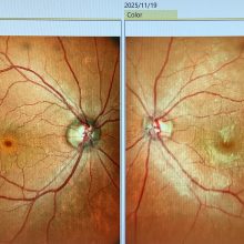 今日、黄斑上膜の硝子体手術の申し込みをいただいた 歳代の女性の方は、 頃から黄斑上膜を認めていました。黄斑上膜の手術は視力が下がった時が時期になることが多いですが、この方の場合、視力はまだ1.2は出ていたものの、ご本人の歪みの症状が強くなってきたため、手術の方針とさせていただきました。黄斑上膜は黄斑の上に異常な膜が張って黄斑の形が悪くなってしまい、歪んで見えにくさが出てしまう病気ですが、黄斑上膜の手術は“硝子体手術”で(硝子体を取った後に)黄斑上膜を取り除く手術になります。黄斑の形が悪くなって見えにくくなっているのに、黄斑の形がよくなるかどうかは、膜を剥がした結果次第となってしまいます。黄斑上膜があっても、黄斑の形状が正常であれば放っておいても構わないですが、黄斑上膜が黄斑を変形させているならば、その力が強いほど、その影響が長いほど黄斑の変形が治りにくくなります。なので、視力が良好であっても症状が出ていて黄斑の形状が悪くなってしまっている場合は手術をした方がよいかと考えています。今日の患者さんも視力は1.2でしたが黄斑は窪みがなくなって平らになってしまい歪みの症状が強くなっていましたし、年齢も若く、今、手術をしないとしても、いずれどこかの時点で手術が必要となる可能性が高く、進行してから手術をして黄斑にダメージを残してしまうよりは、なるべく悪い影響が出ないうちに手術をした方が得策かと思い、手術の方向で予定させていただきました。もちろん、手術は100%ということはないので、合併症のリスクはありますが、いずれ手術をするのであれば、そのリスクはどの時点でも覚悟しないといけないことなので、あまり考え過ぎる必要はないかとは思います。でも、合併症が起これば、手術しなければよかったと思ってしまうことはどうしてもあるかと思うので、少しでもそう思わないで済むような手術をしたいと思います。